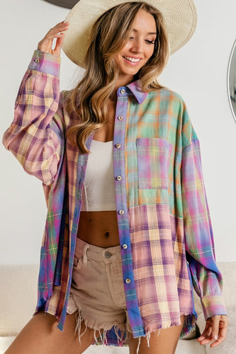 BiBi Plaid Color Block Raw Hem Shirt
