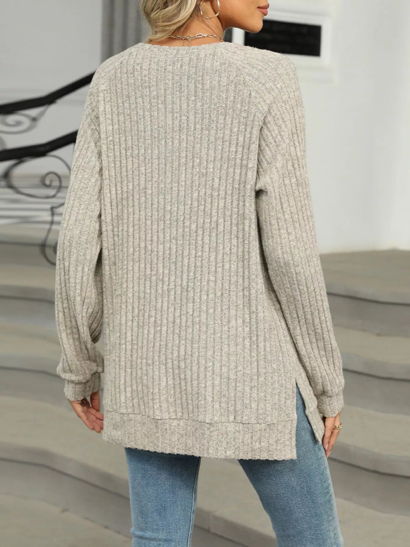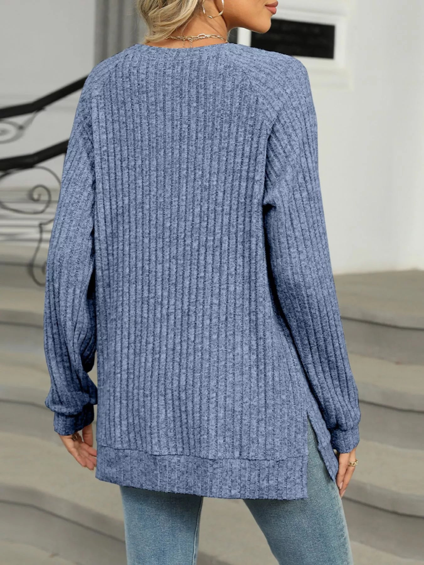 Round Neck Side Slit Ribbed Knit Top with Asymmetric Button Detail