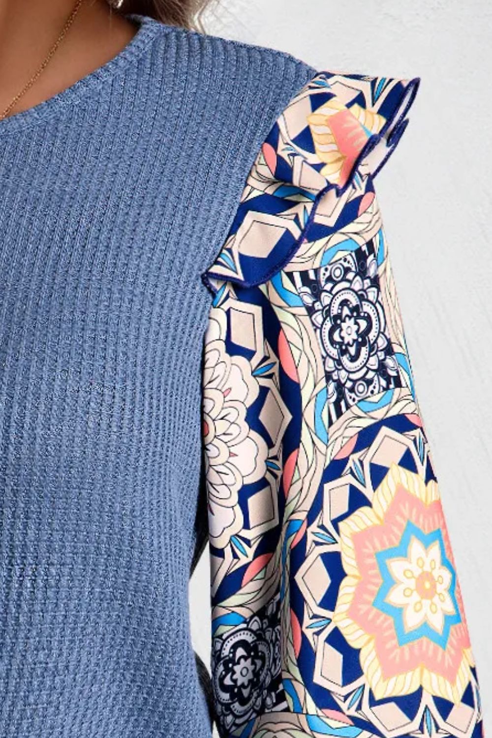 • Load image into Gallery viewer, Ruffled Printed Round Neck Long Sleeve Top