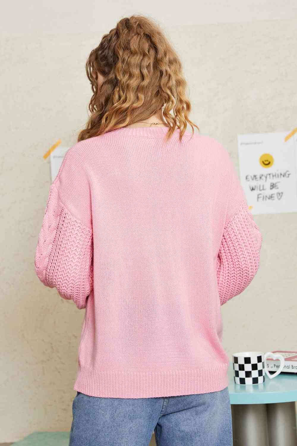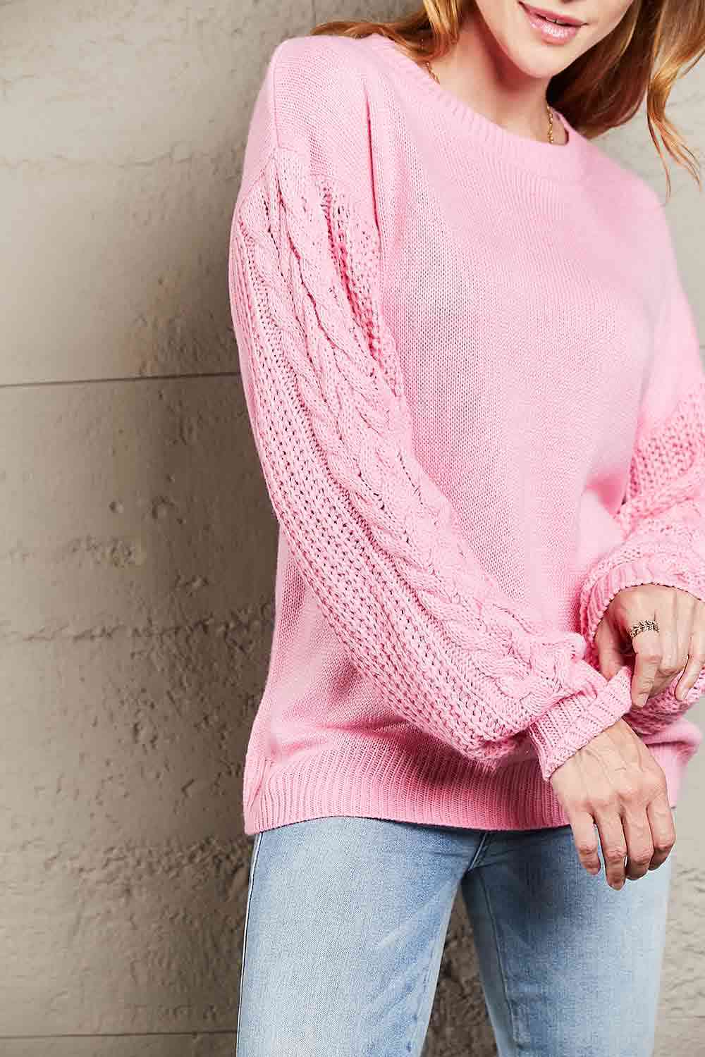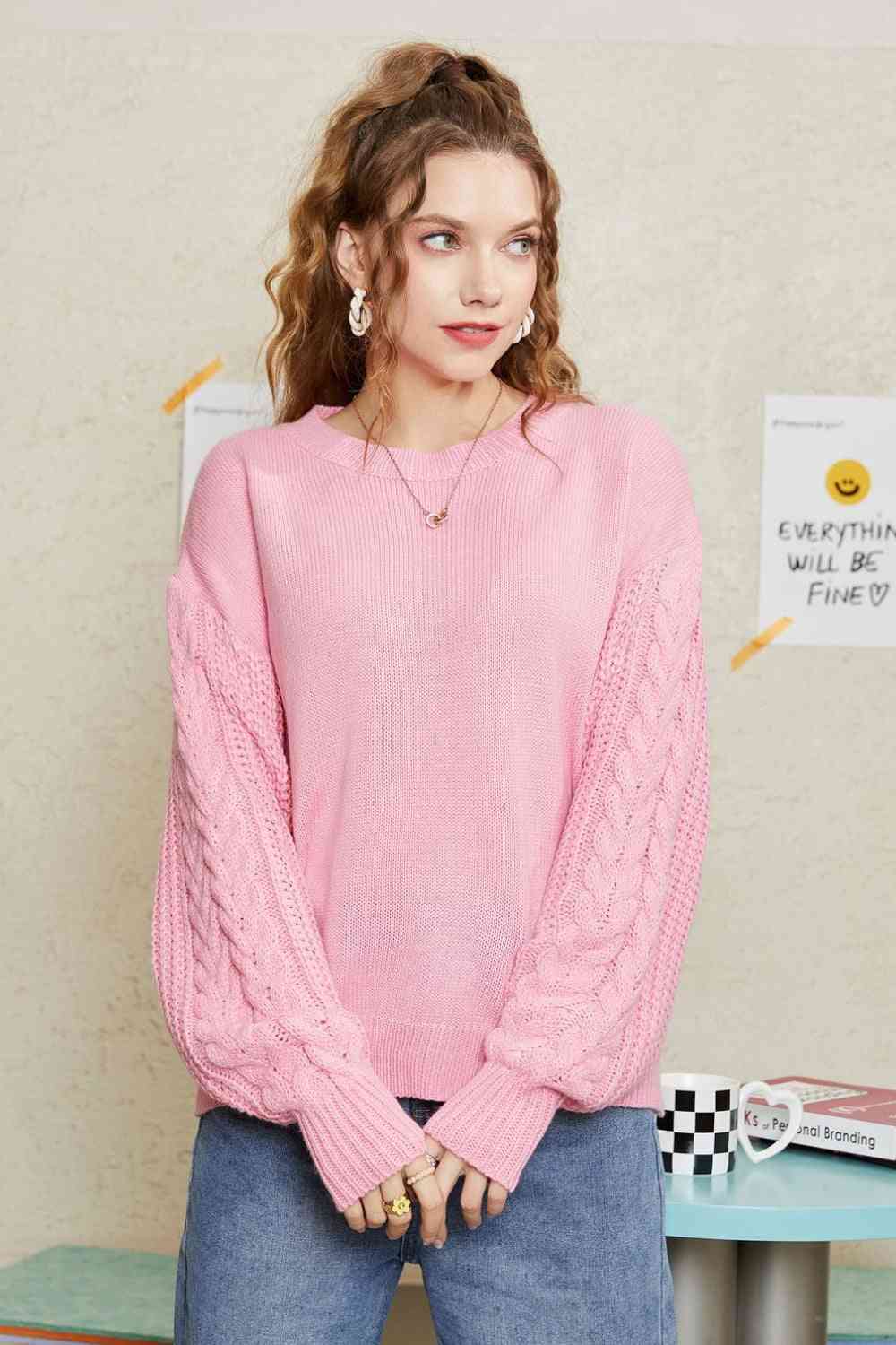 Double Take Round Neck Cable-Knit Dropped Shoulder Sweater