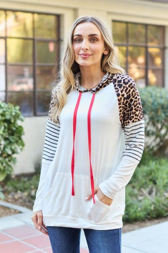 Celeste Design Full Size Leopard Contrast Drawstring Hoodie