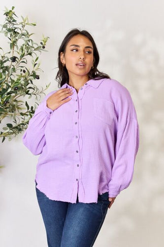 Zenana Full Size Texture Button Up Raw Hem Long Sleeve Shirt