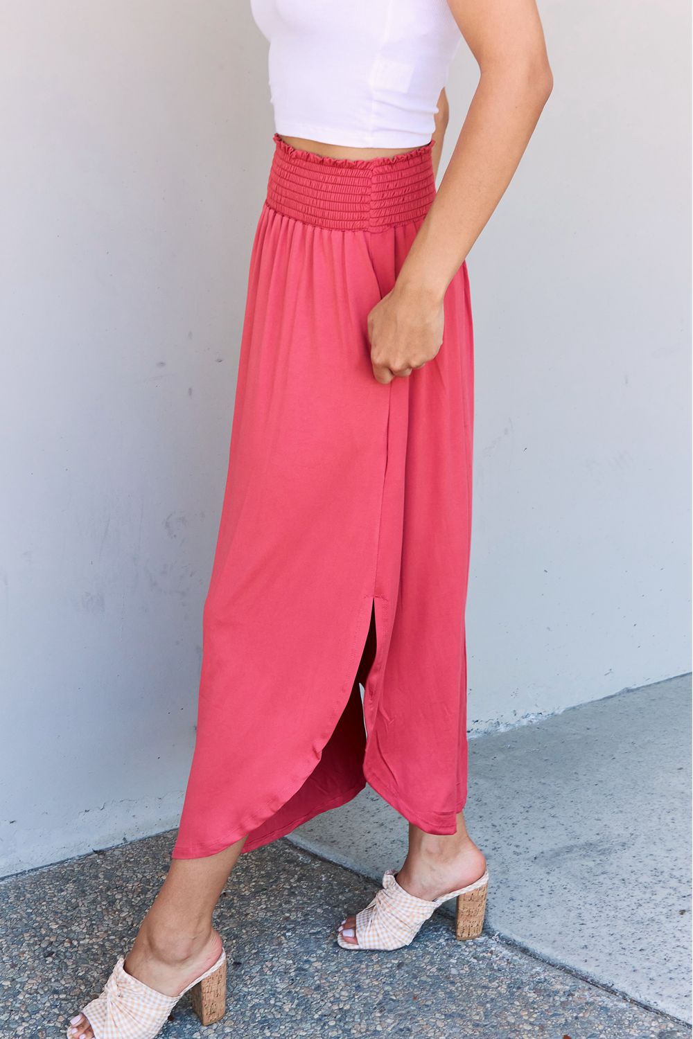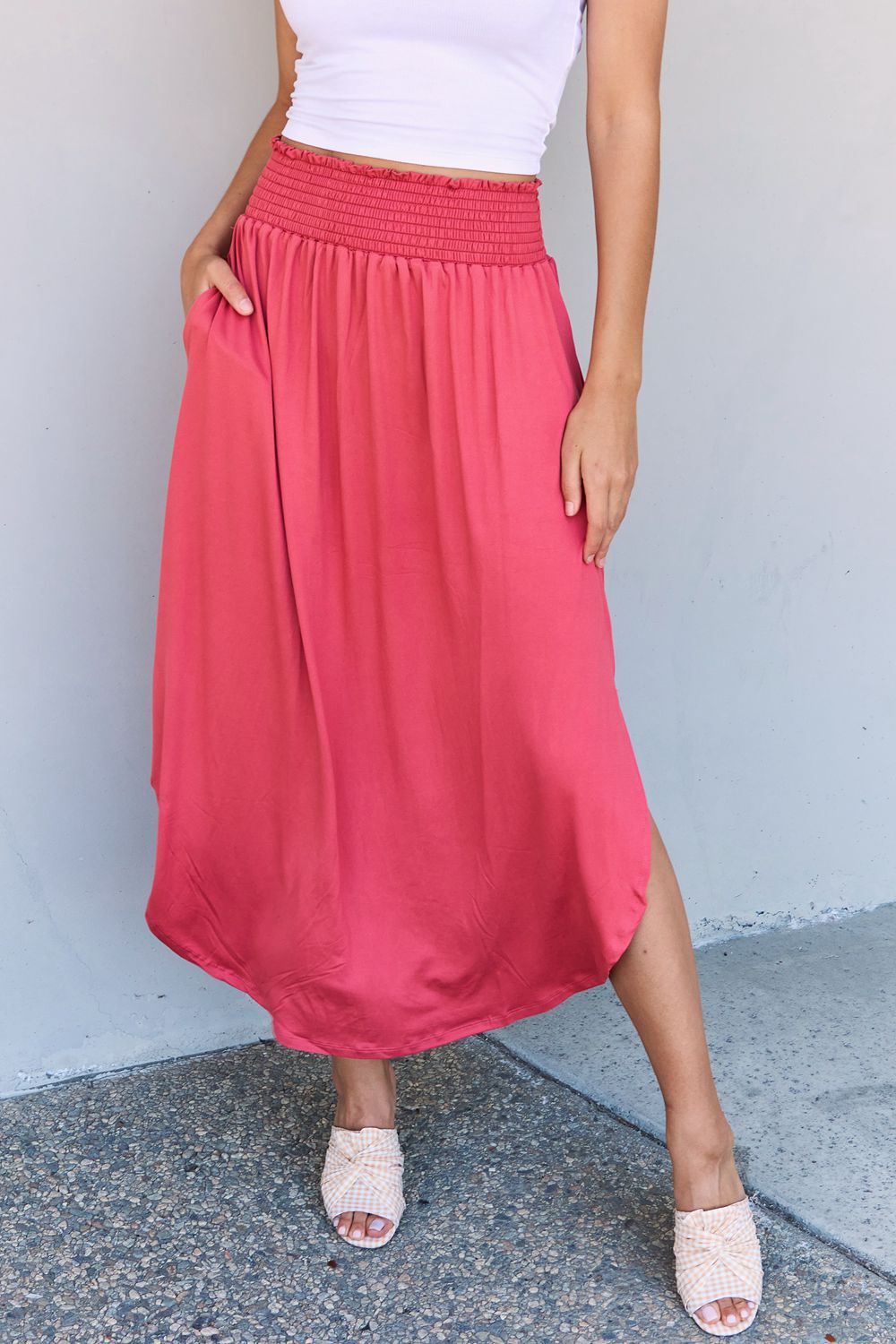 This elegant skirt is designed to make a statement while keeping you comfortable and chic all day long. This maxi skirt offers a luxurious feel against your skin and drapes beautifully. The high waistline is both flattering and on-trend, accentuating your curves and creating a sophisticated silhouette. Whether you're dressing up for a special occasion or simply adding a touch of elegance to your everyday look, this skirt is a must-have in your wardrobe. The scoop hem design adds a unique and modern twist to the classic maxi skirt. The front hem is slightly shorter, while the back hem gracefully cascades down, creating a visually stunning effect. The side slits allow for ease of movement, adding a touch of allure as you walk or dance. This solid-colored skirt is a versatile piece that can be effortlessly dressed up or down. Pair it with a fitted blouse and heels for a polished, evening ensemble, or dress it down with a casual tee and sandals for a relaxed yet stylish daytime look. The possibilities are endless!