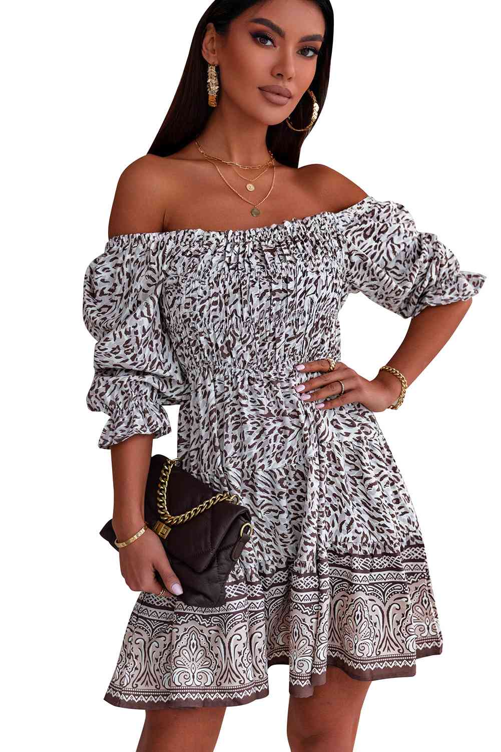 - Neckline: Off-shoulder