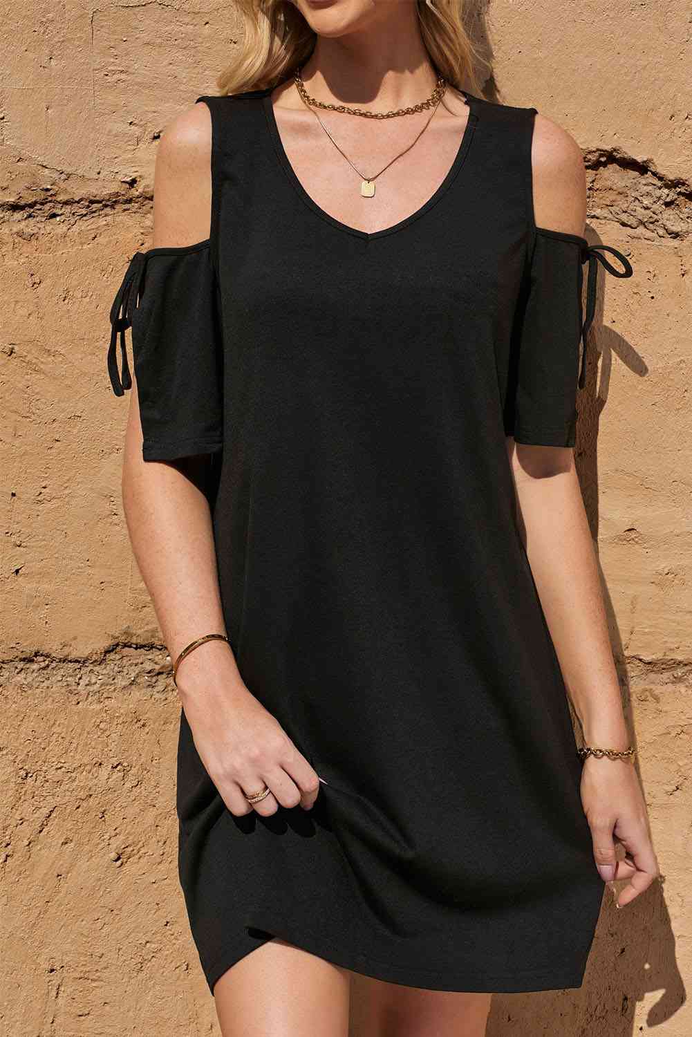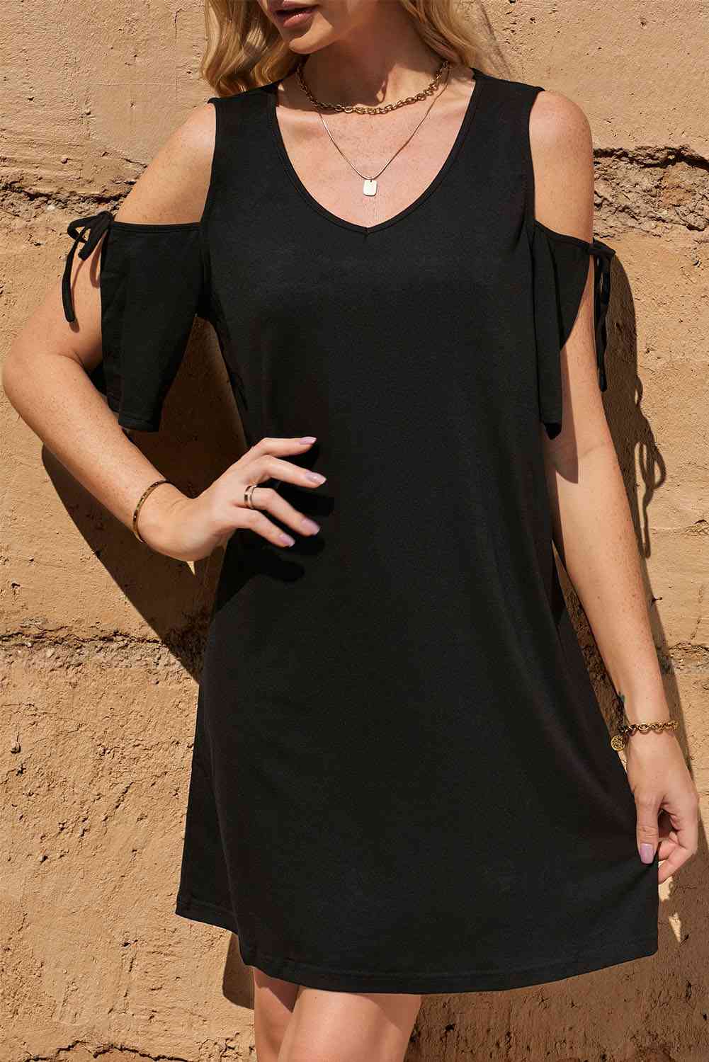 Tied Cold-Shoulder V-Neck Mini Dress