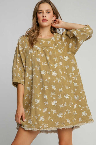 Umgee Raw Hem Floral Print Round Neck Denim Dress