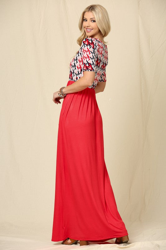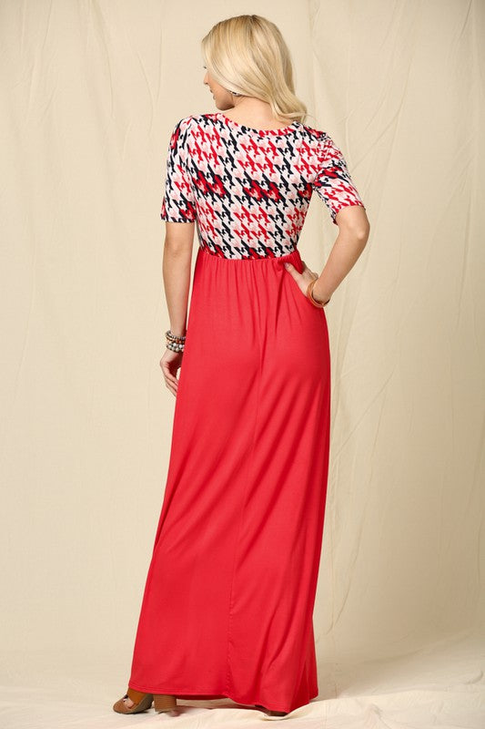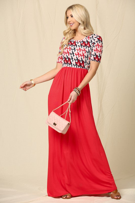 A houndstooth round neck short sleeve maxi dress is a classic and sophisticated option for your wardrobe. Houndstooth is a timeless pattern that adds a touch of elegance to any outfit. This style of dress can be dressed up with heels and statement jewelry for a formal event or dressed down with flats for a more casual look. It's a versatile piece that you can wear for different occasions. Enjoy styling and wearing your houndstooth maxi dress!