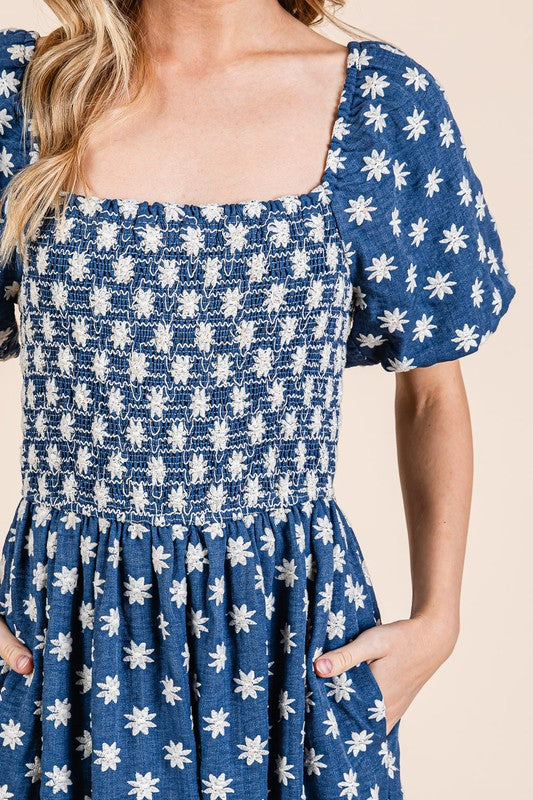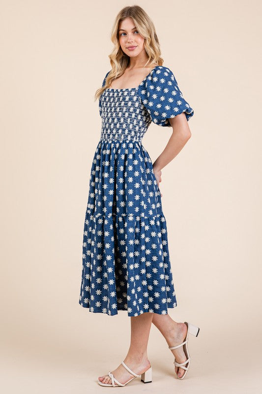 GeeGee Floral Embroidered Smocked Puff Sleeve Tiered Midi Dress
