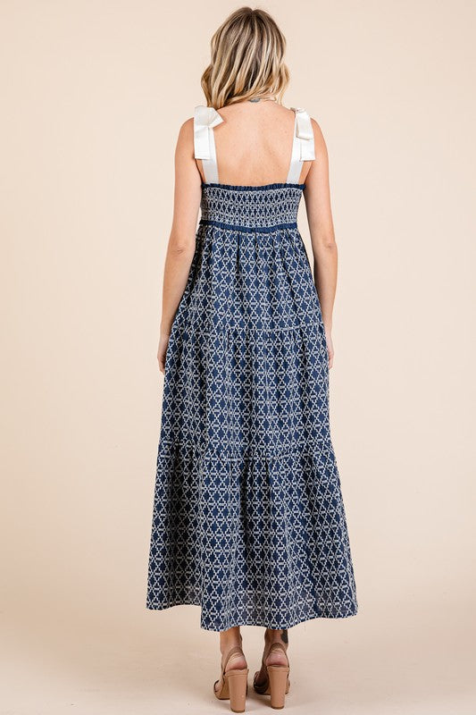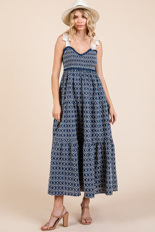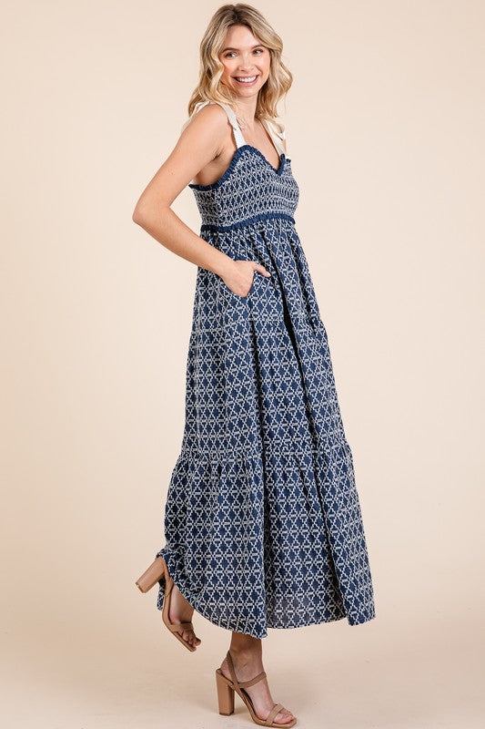 GeeGee Geometric Embroidered Smocked Tie Shoulder Midi Dress