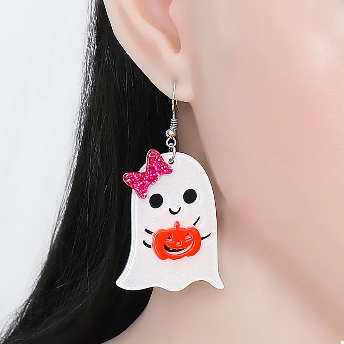 Halloween Ghost Dangle Earrings with Bow and Pumpkin