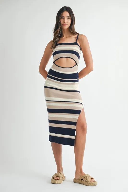 The multi-color striped front cutout knit midi dress is a trendy and eye-catching option for your wardrobe. The vibrant stripes add a playful and colorful touch to the dress, while the front cutout detail creates a modern and chic look. Perfect for a fun day out or a summer event, this dress exudes a stylish and dynamic vibe. Pair it with sneakers or sandals for a casual yet fashionable ensemble that will make a statement. Enjoy the bold and trendy style of this unique multi-color striped midi dress!