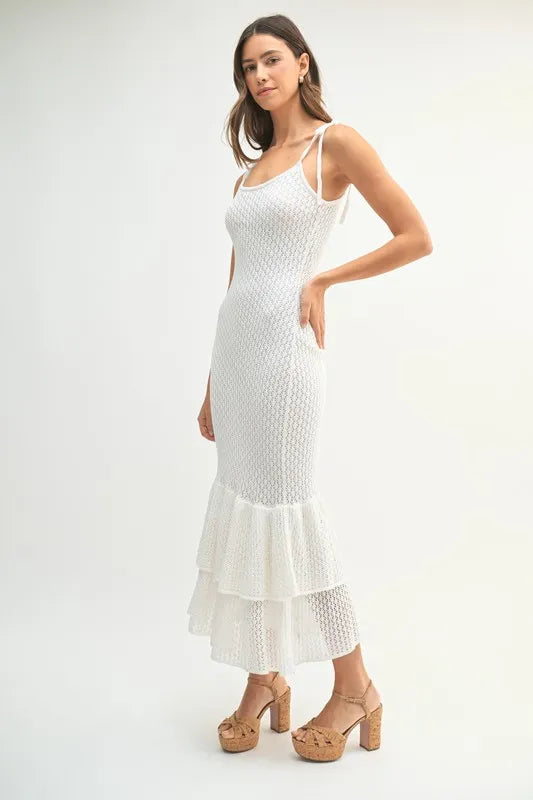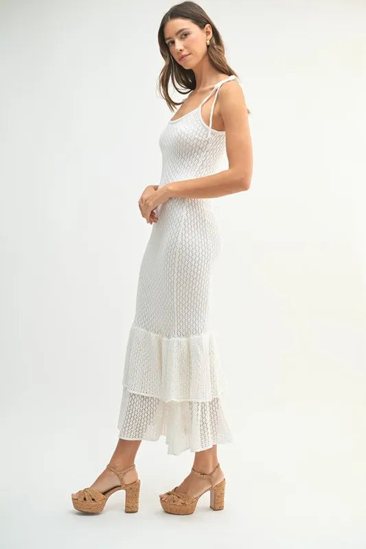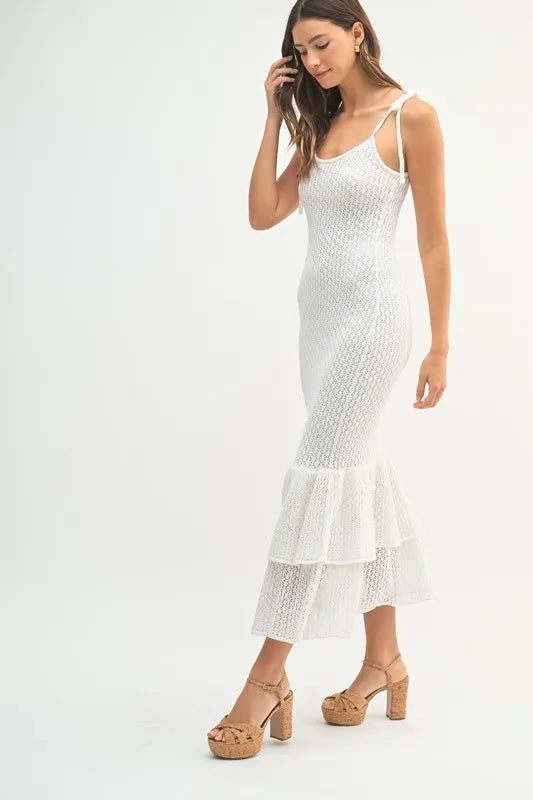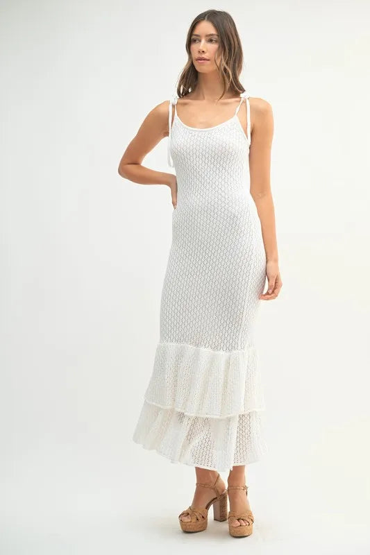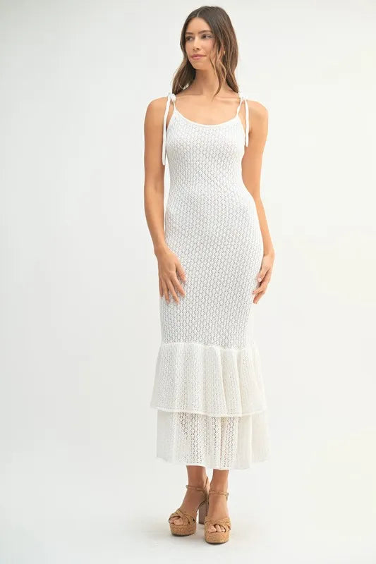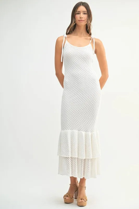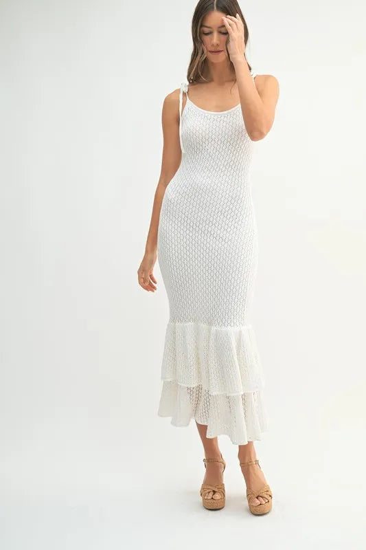 This sleeveless midi dress features shoulder ties and a lovely rose knit design for a feminine and elegant look. The flattering silhouette and charming details make it a versatile option for various occasions. Embrace a romantic and chic style with this sleeveless shoulder tie rose knit midi dress.