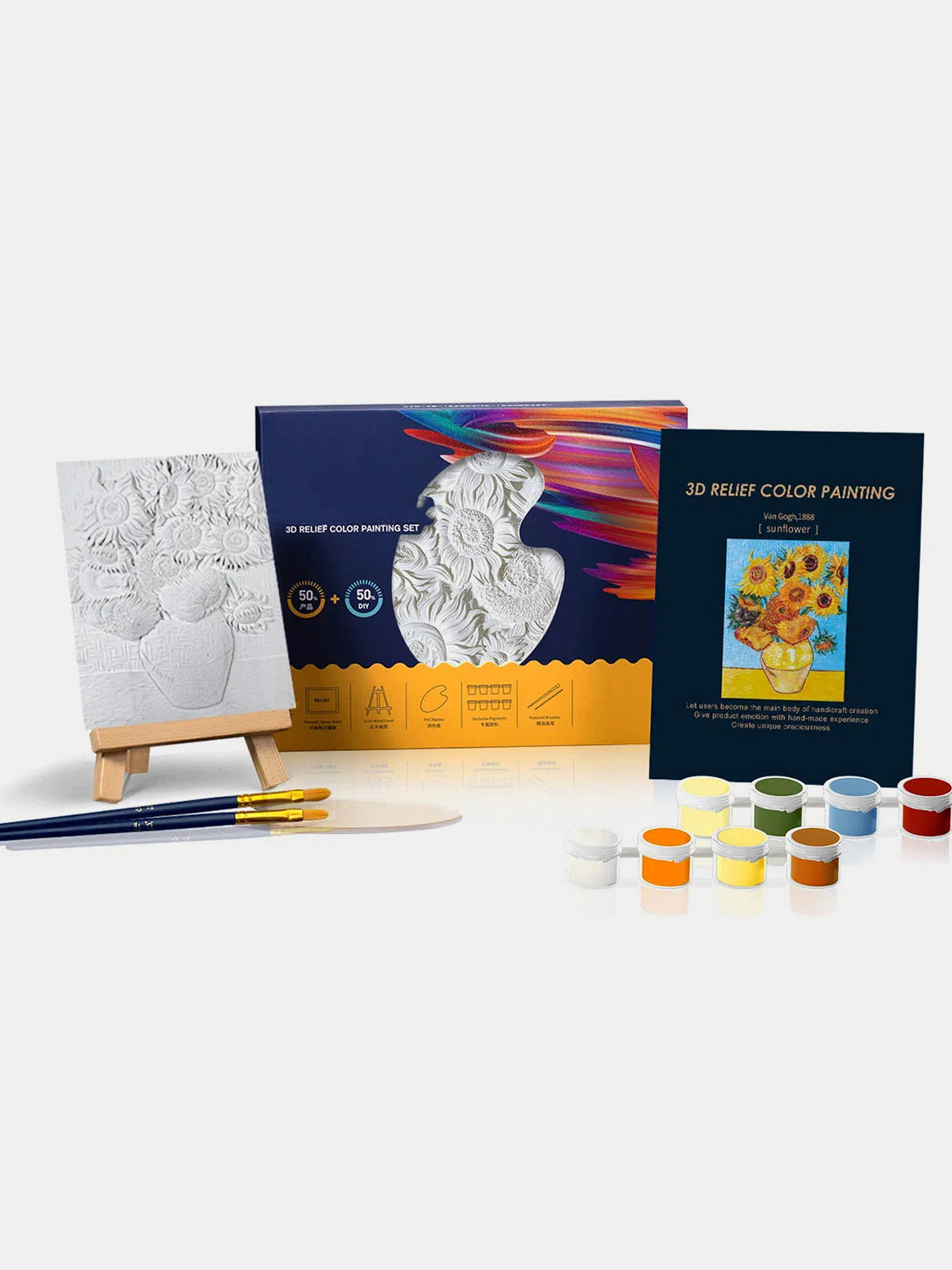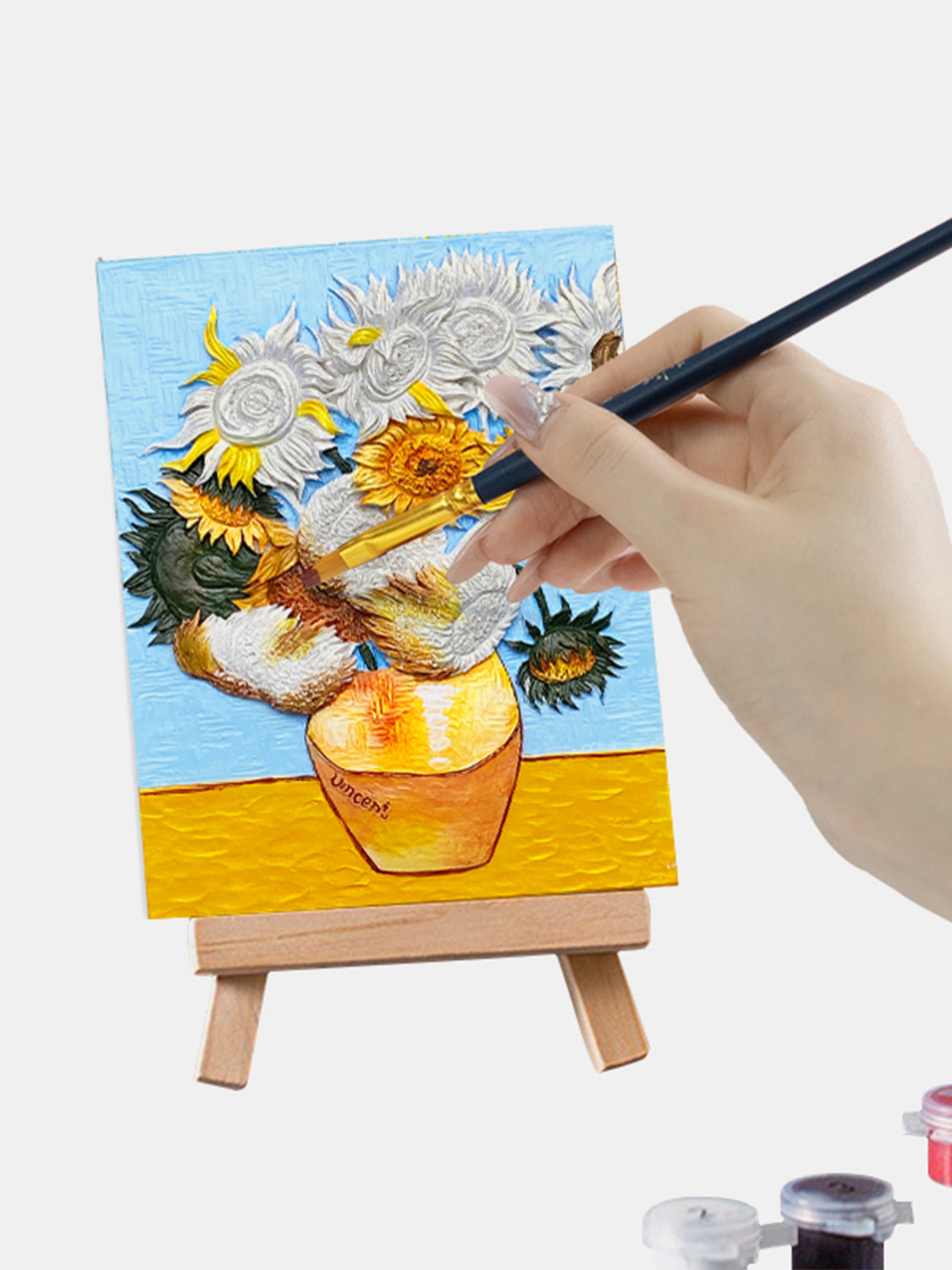 A Van Gogh's Sunflowers DIY 3D oil painting kit is a creative and artistic project inspired by Vincent van Gogh's famous series of sunflower paintings. This kit typically includes a canvas with a pre-printed outline of the sunflowers, oil paints, brushes, and instructions for painting the artwork. The 3D aspect of the painting might involve adding texture or layering the paint to create a sense of depth and dimension to the sunflowers. By following the instructions and using the materials provided in the kit, you can recreate Van Gogh's masterpiece in your own style and enjoy a fun and immersive painting experience. It's a great way to unleash your creativity and create a beautiful piece of art to display in your home.