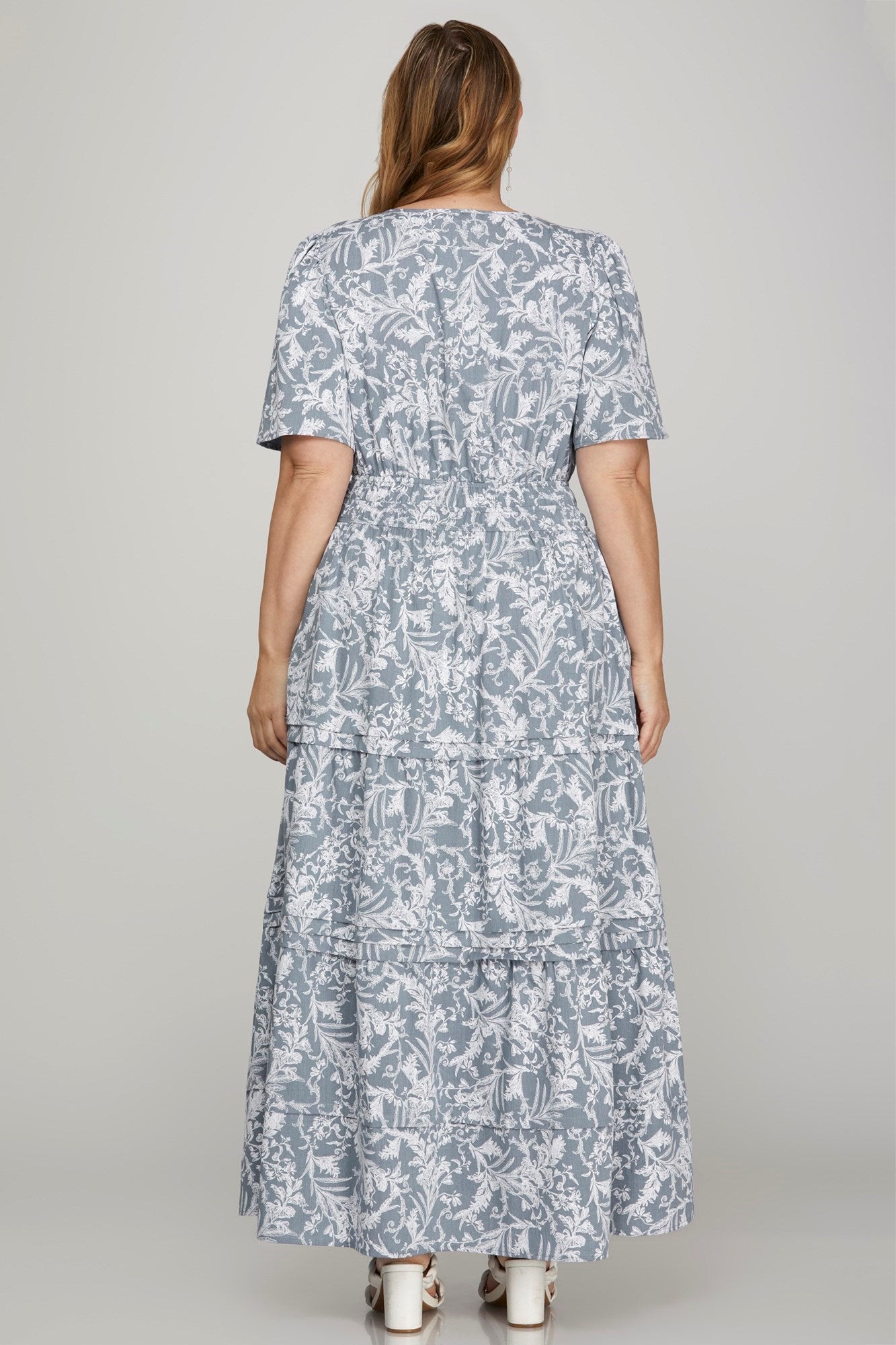This maxi dress features a printed design and notched neckline. It is crafted from woven fabric with tiered pintuck detailing. The dress comes with convenient side pockets for added functionality. Perfect for a stylish and comfortable look for any occasion.