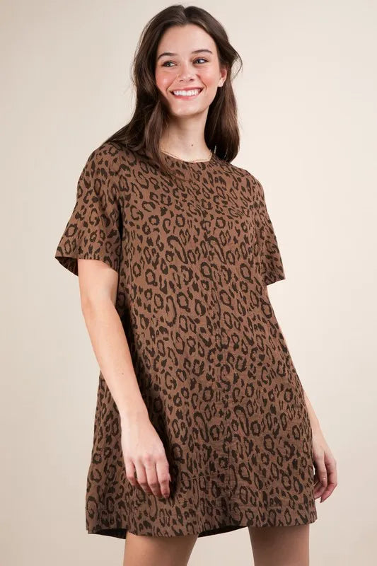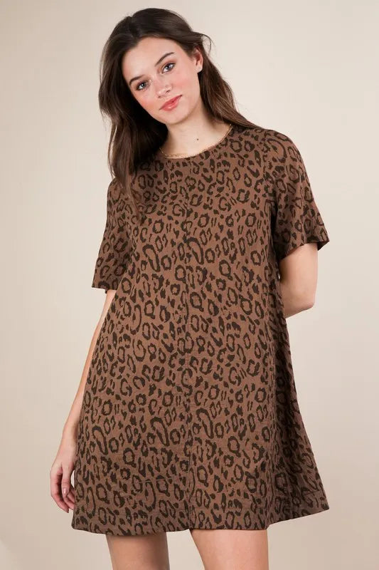 A leopard-printed comfy mini dress is a trendy and comfortable piece with a stylish animal print pattern. This dress combines a fashionable leopard print with a relaxed and easy-to-wear mini-length silhouette. Perfect for both casual outings and adding a touch of flair to your wardrobe, this dress is a versatile and on-trend choice for any fashionista.