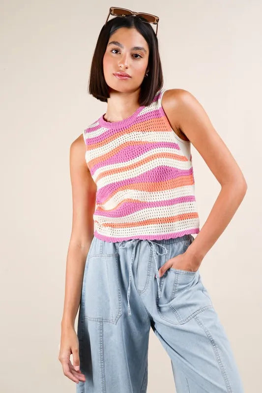 A multi-color stripe knit crop tank is a trendy and eye-catching top featuring colorful stripes in a cropped silhouette. This tank is perfect for adding a fun and playful pop of color to your outfit. The knit fabric offers a comfortable and stretchy fit, making it ideal for warm weather days. Pair this crop tank with high-waisted bottoms for a fashionable and stylish look.