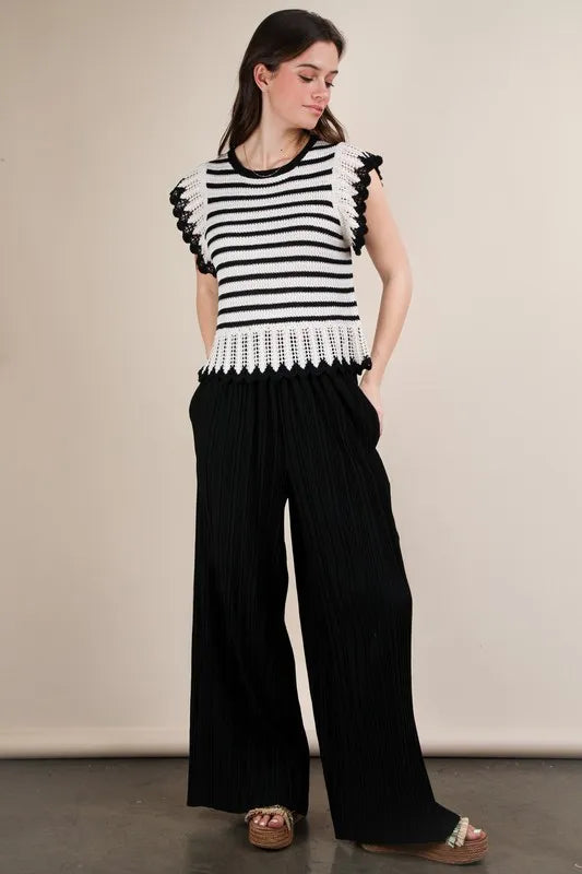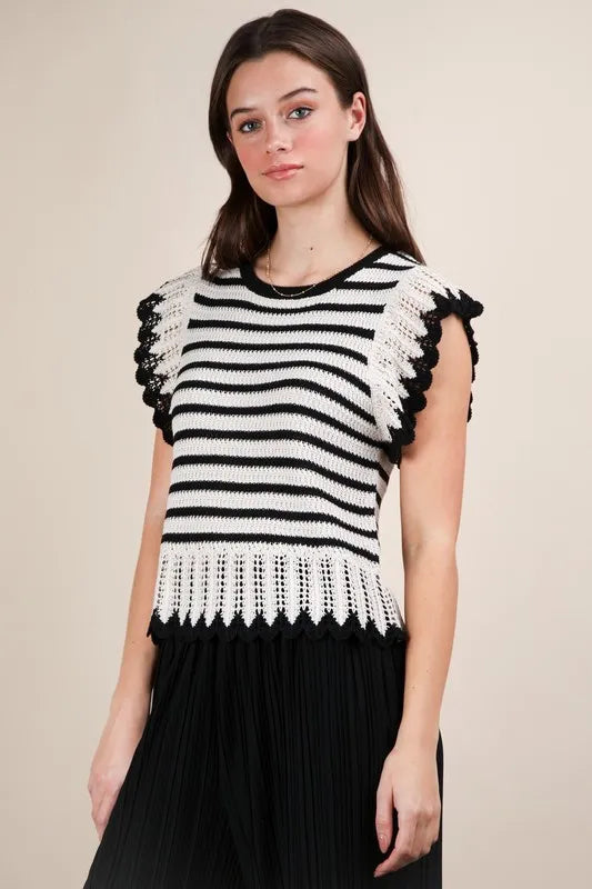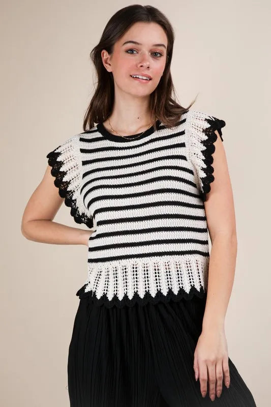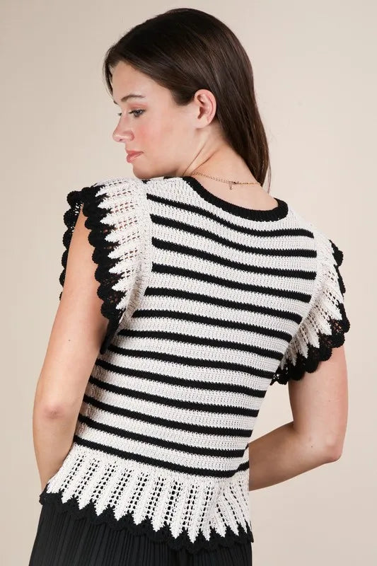 A ruffled detail striped knit sweater top combines texture and style effortlessly. The stripes add a classic touch, while the ruffles bring a feminine flair. This versatile top can be dressed up or down for any occasion.