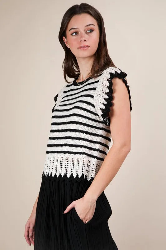 VERY J Ruffle Detail Striped Knit Sweater Top