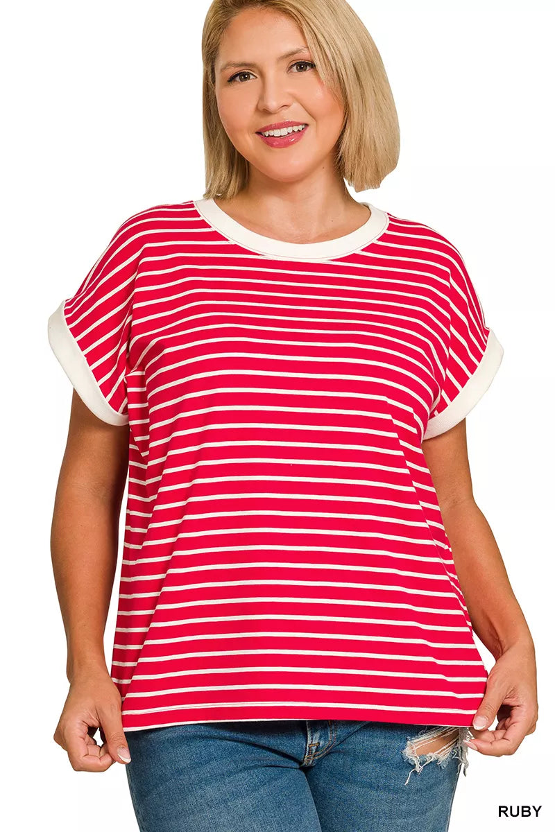 The Contrast Trim Cap Sleeve Stripe Tee is a stylish and versatile top featuring a unique design. The contrasting trim adds a modern touch to the classic striped pattern. With cap sleeves, this tee provides a feminine and flattering silhouette. The perfect choice for casual or semi-formal occasions, this tee can be easily dressed up or down. Made from high-quality materials, this tee ensures both comfort and style.