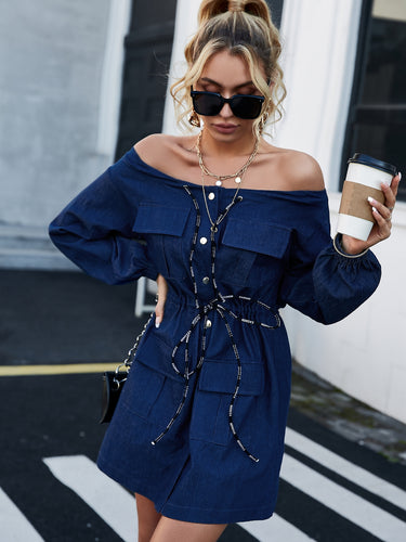 • Off-Shoulder Drawstring Denim Dress with Pockets