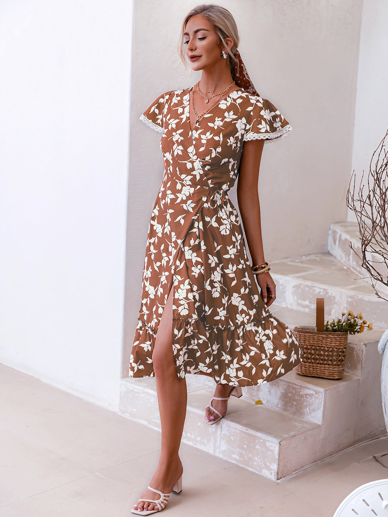 Floral Lace Trim Tie-Waist Surplice Wrap Dress