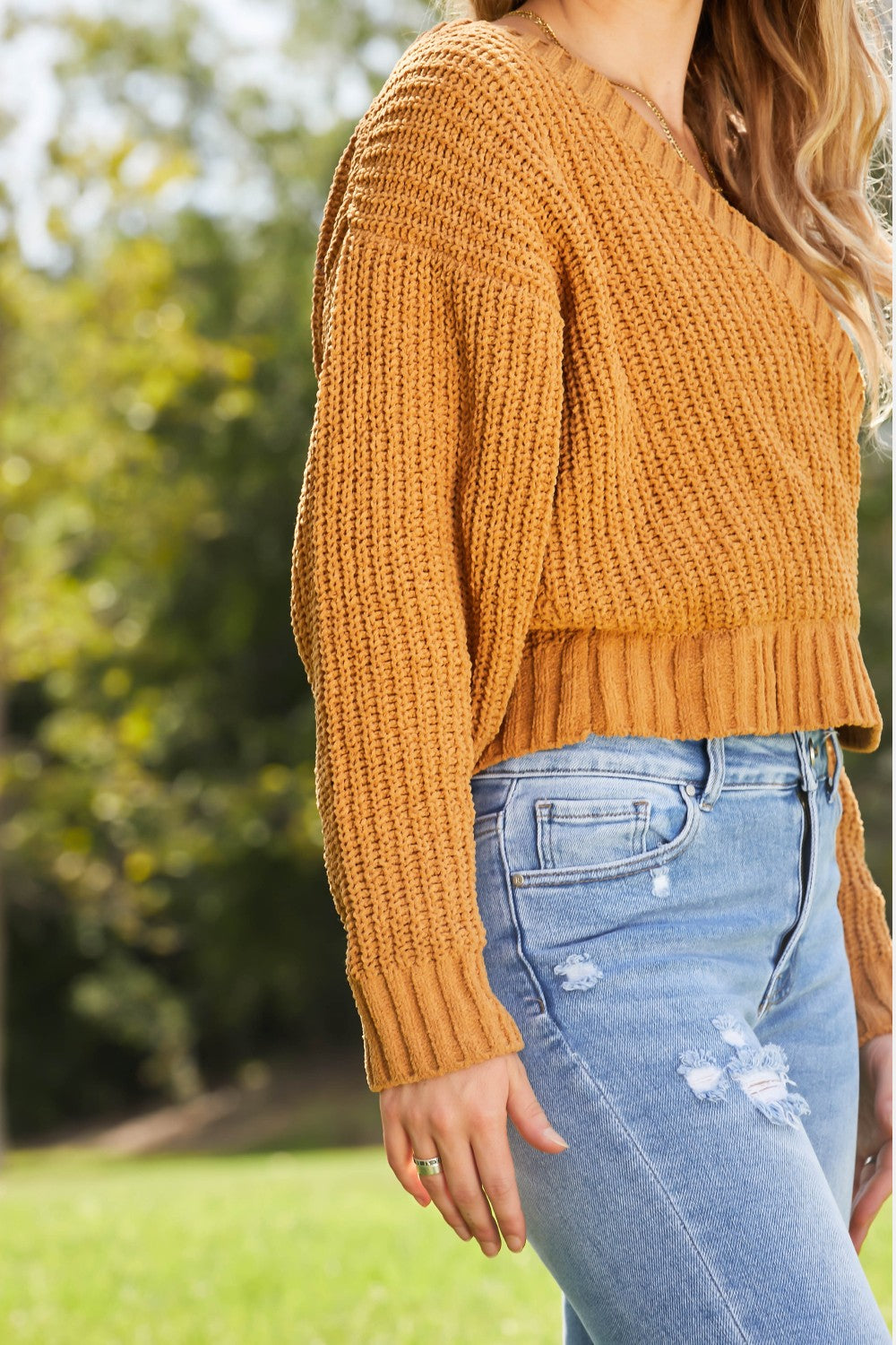 A faux wrap surplice design shapes this sweater, finished off with textured trim for a contrasting statement.
