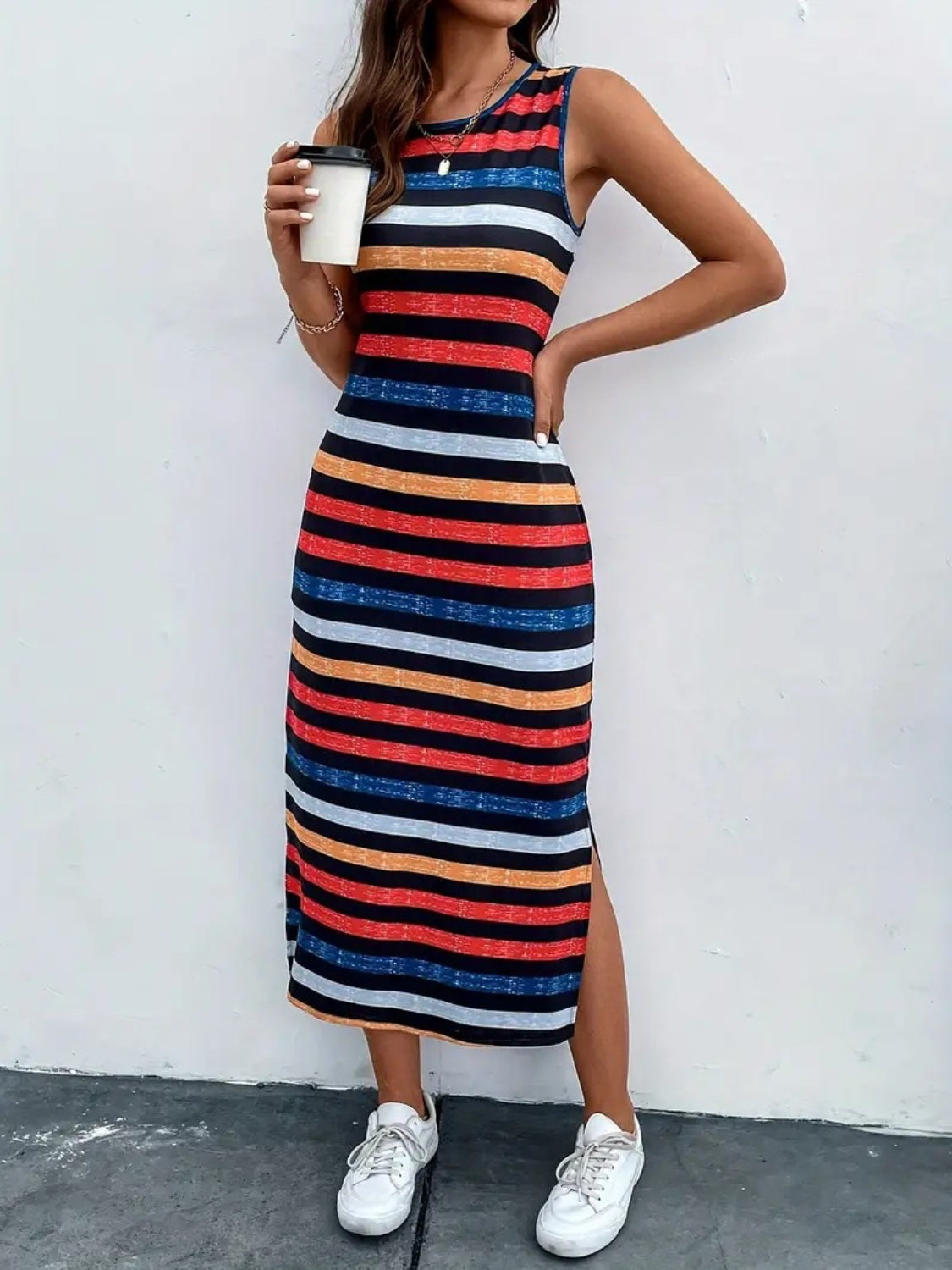 • Load image into Gallery viewer, Slit Striped Round Neck Tank Dress