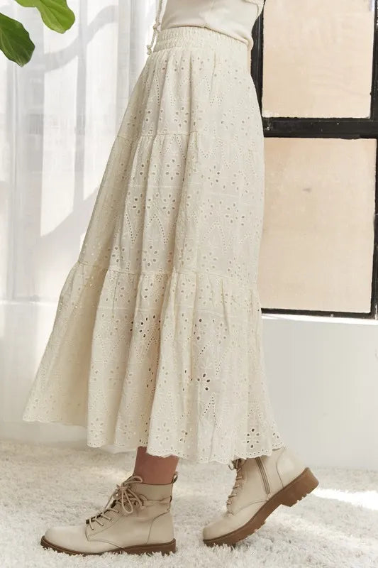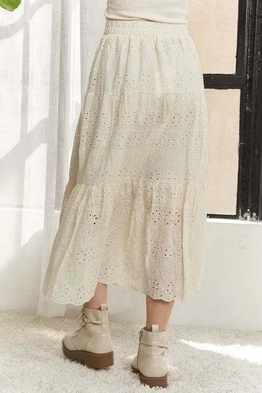 The elastic waistband tiered midi skirt is a versatile and comfortable bottom option featuring multiple tiers of fabric and an elastic waistband for a flattering fit. This skirt offers a flowy and relaxed silhouette that is perfect for various occasions. The elastic waistband provides ease of wear and all-day comfort, making it a practical and stylish choice for creating effortlessly chic and feminine outfits.