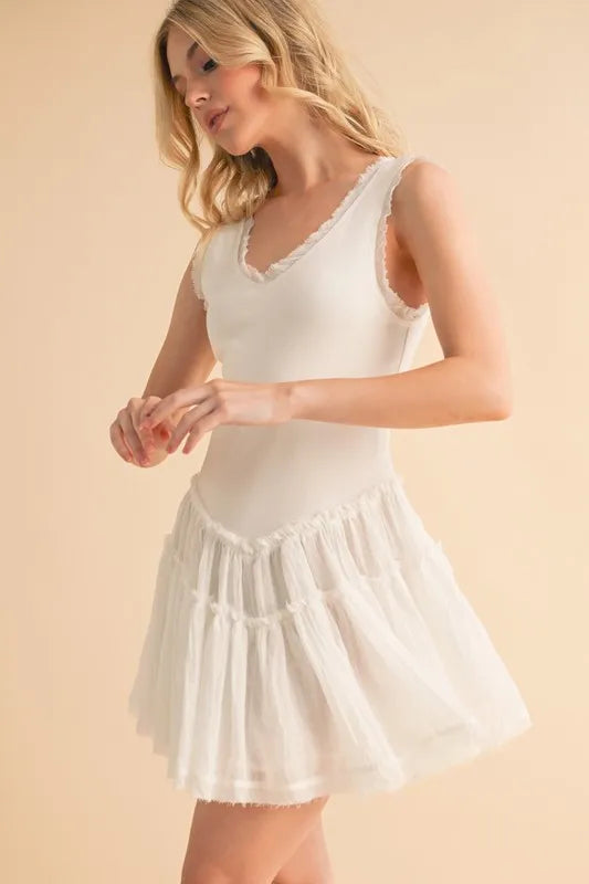 This sleeveless mini dress features charming frill details and a trendy drop waist silhouette. The playful design adds a touch of fun and flair to your wardrobe. Stay stylish and comfortable in this frill sleeveless drop waist mini dress.