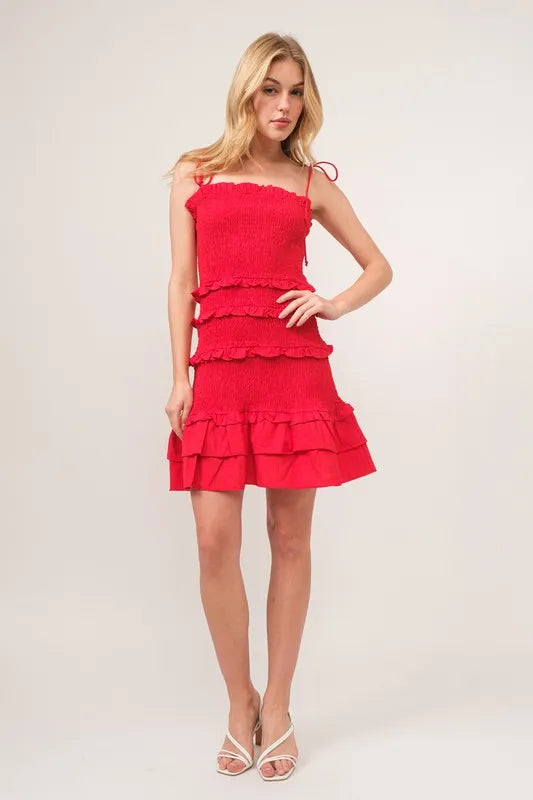 This dress features tied straps, ruffled details, and a smocked design for a feminine and breezy look. The tied straps add a stylish and adjustable element, while the ruffled details bring a touch of charm and movement to the dress. The smocked bodice ensures a comfortable and flattering fit, making it a versatile and easy-to-wear piece for various occasions. Whether dressed up with accessories or worn as is for a casual day out, this dress offers a trendy and chic option for your wardrobe.