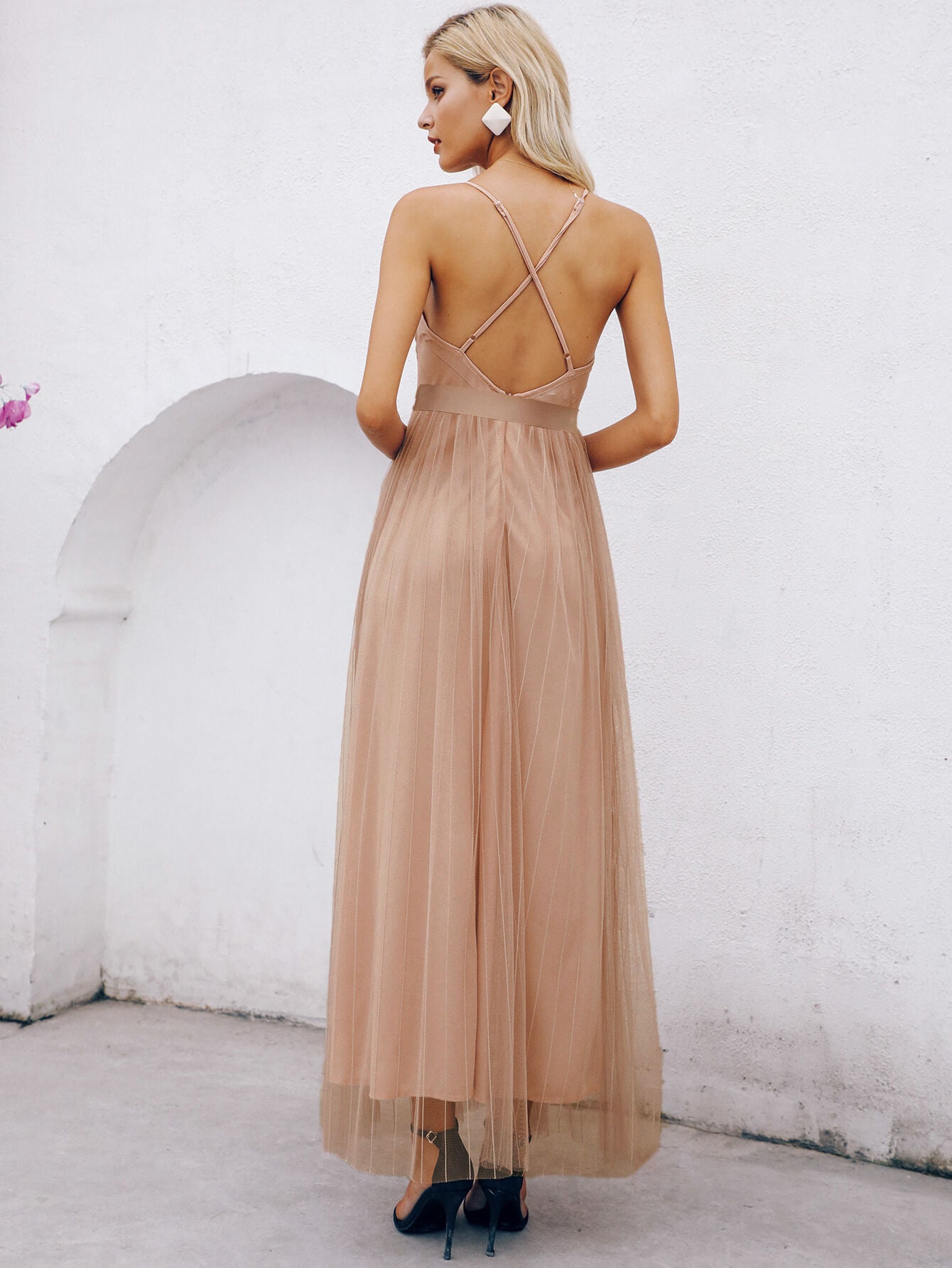 • Load image into Gallery viewer, Belted Crisscross Back Plunge Tulle Dress