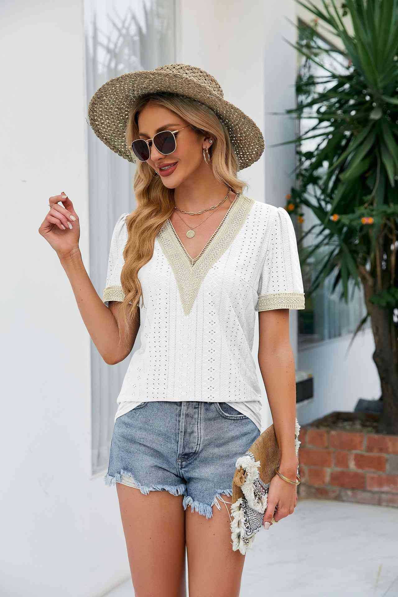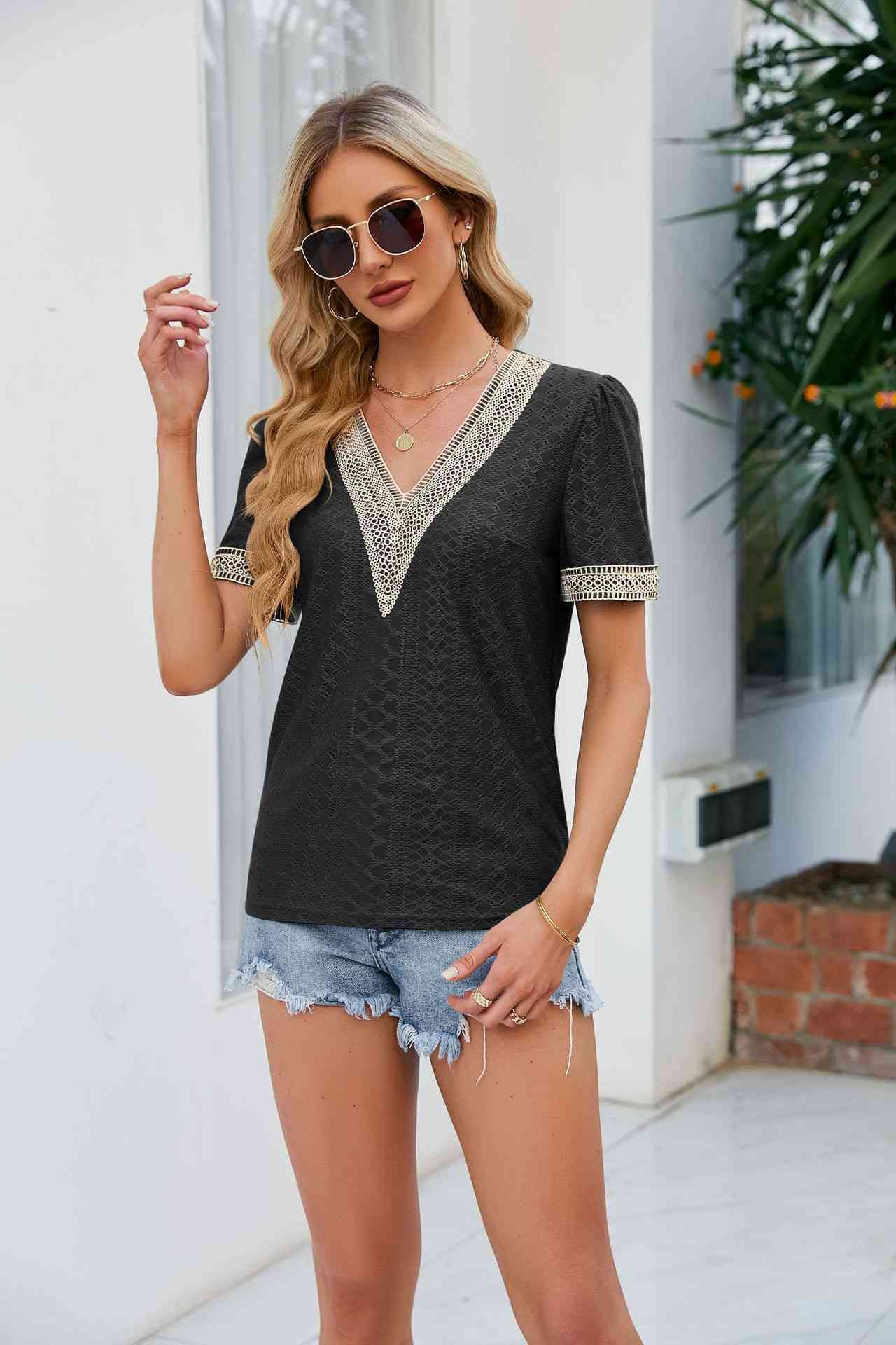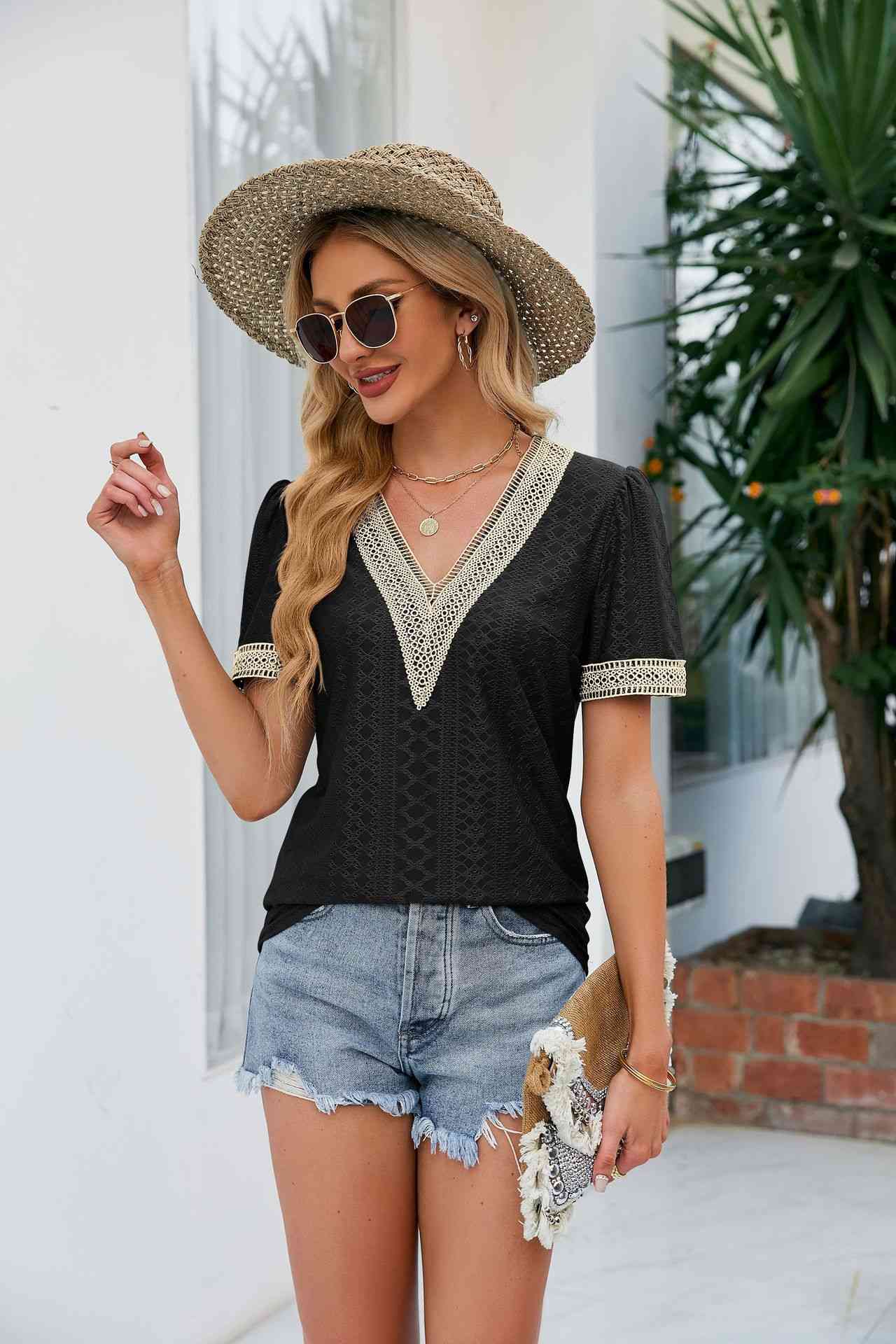• Load image into Gallery viewer, Contrast V-Neck Puff Sleeve Top