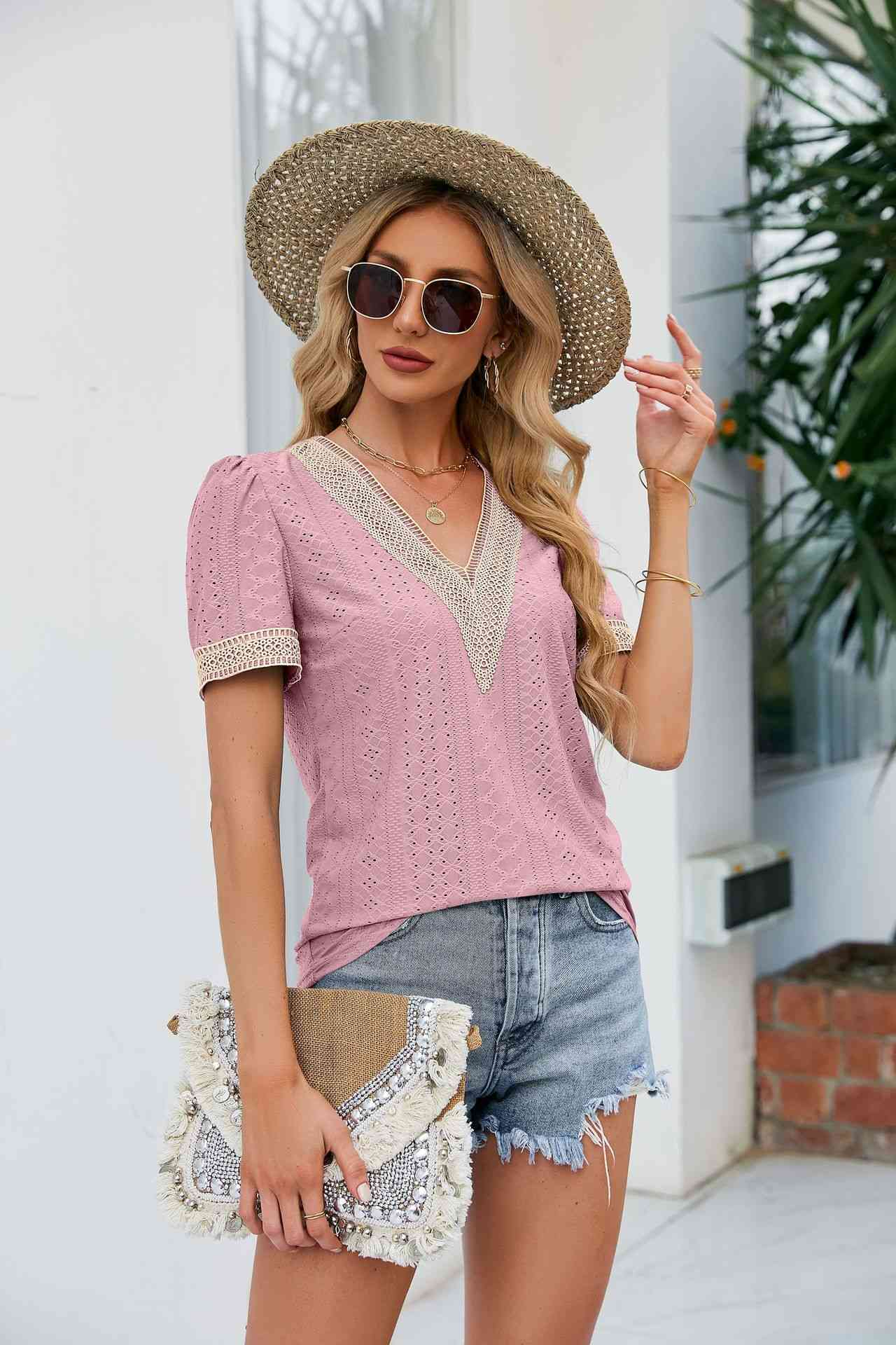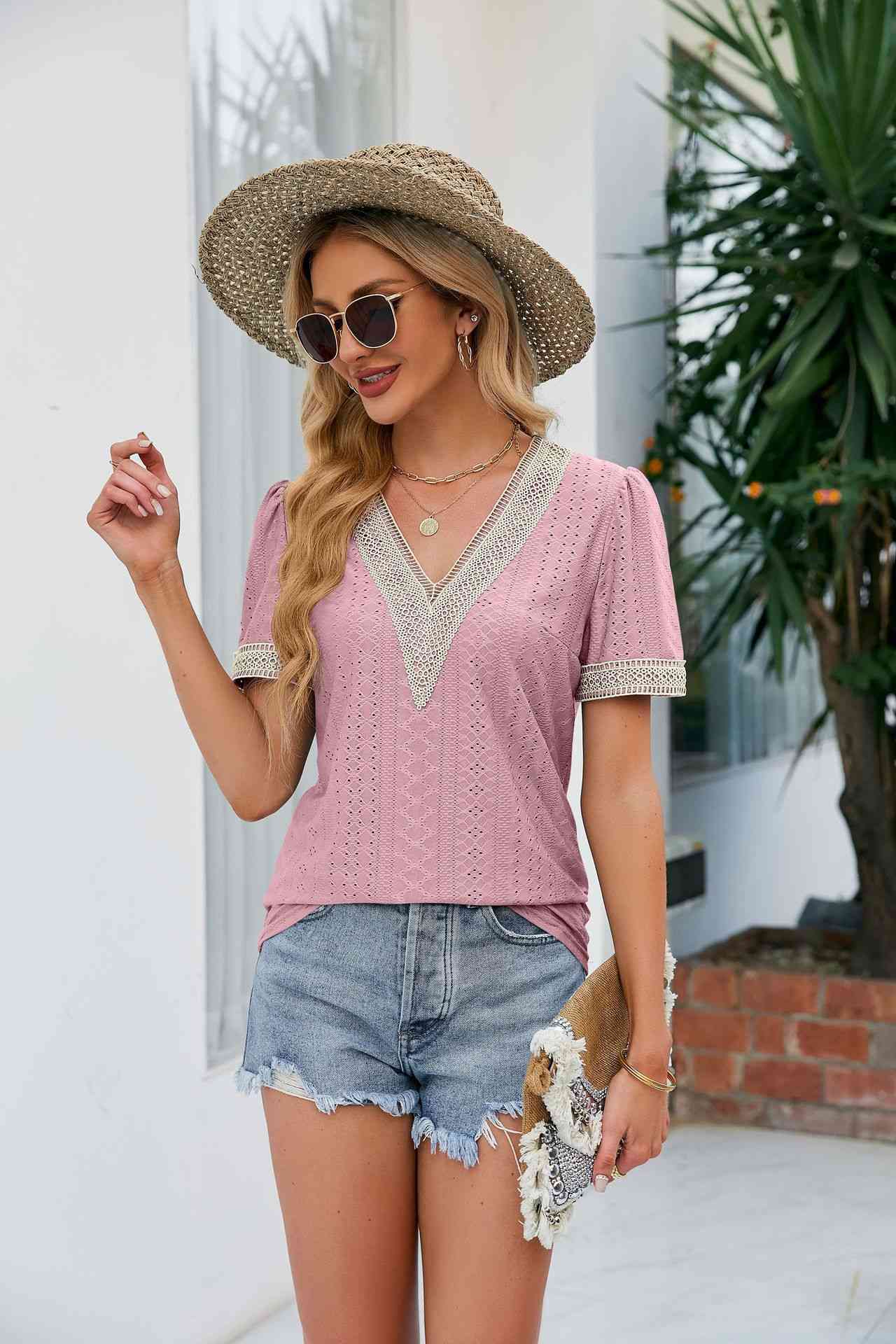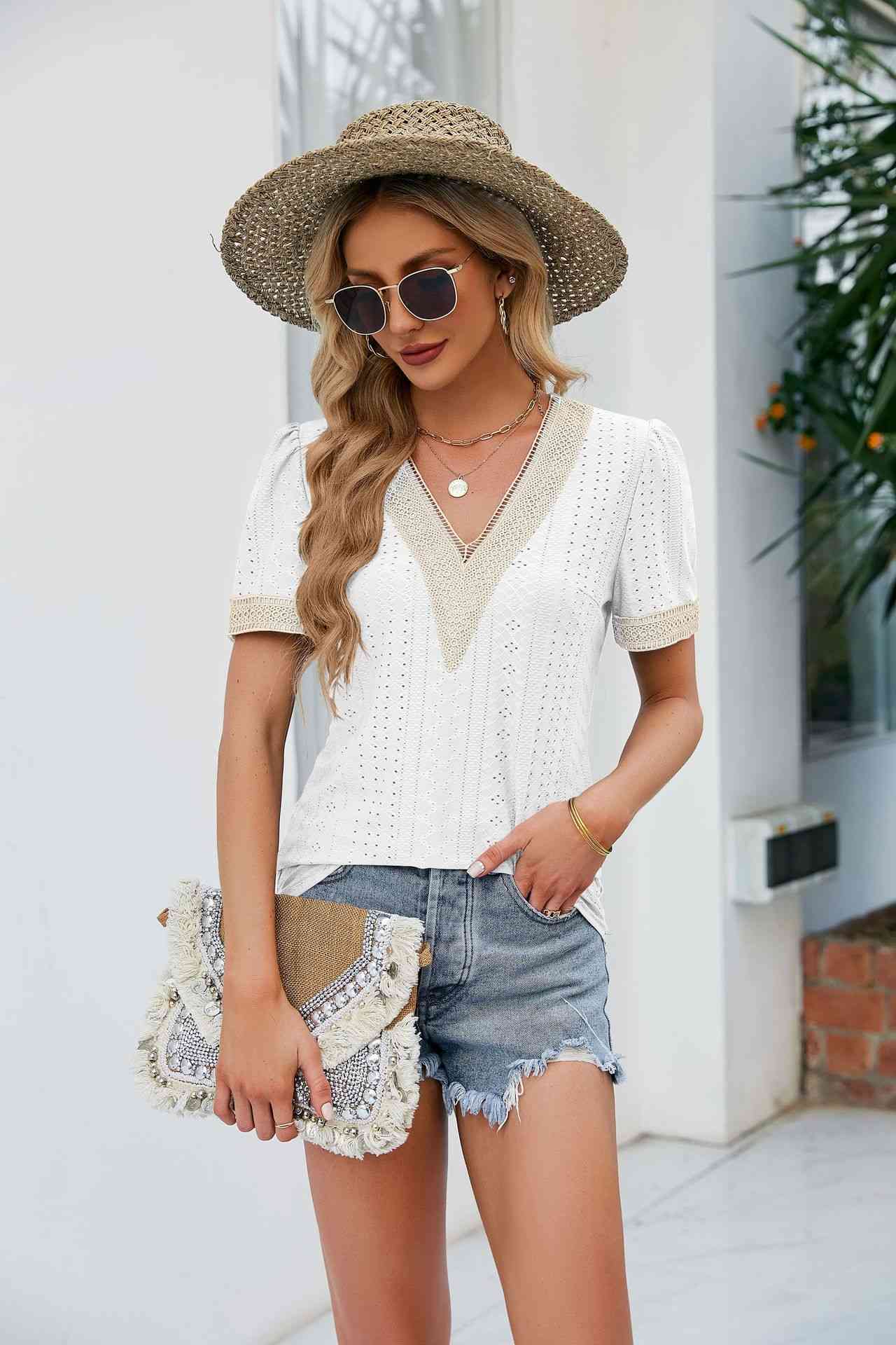 • Load image into Gallery viewer, Contrast V-Neck Puff Sleeve Top