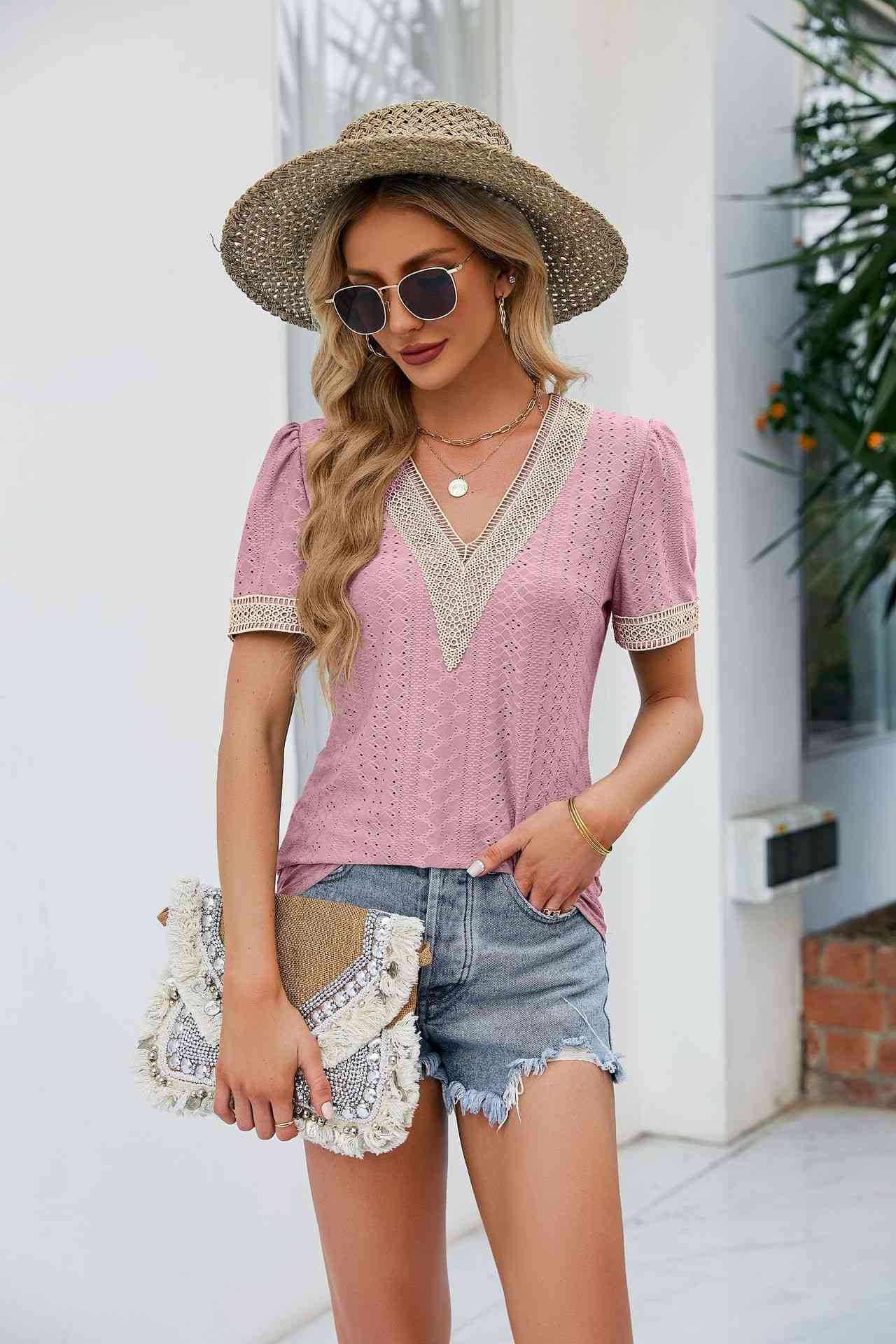 Contrast V-Neck Puff Sleeve Top
