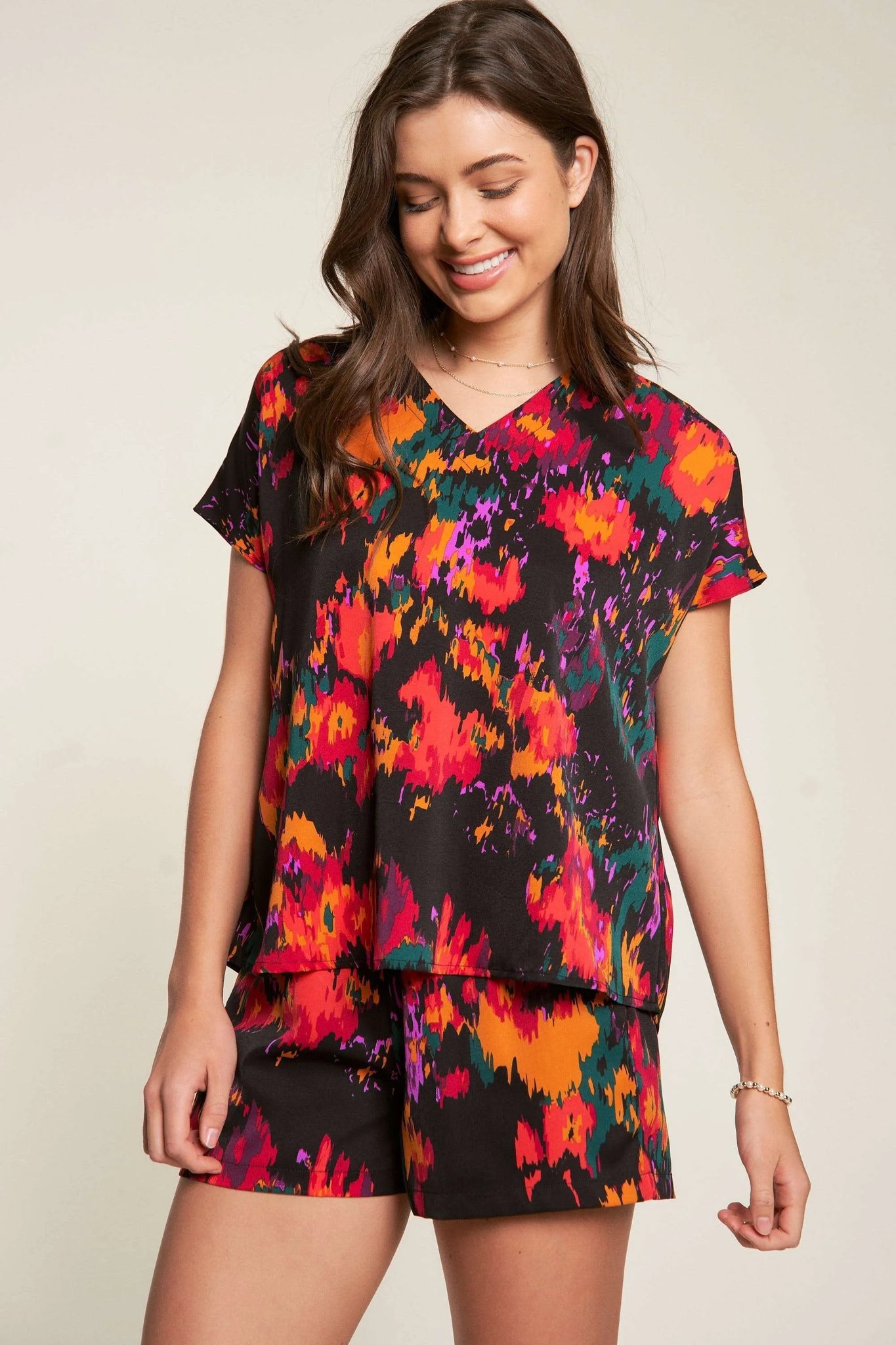 Davi & Dani Printed V Neck Short Sleeve Top and Shorts Set
