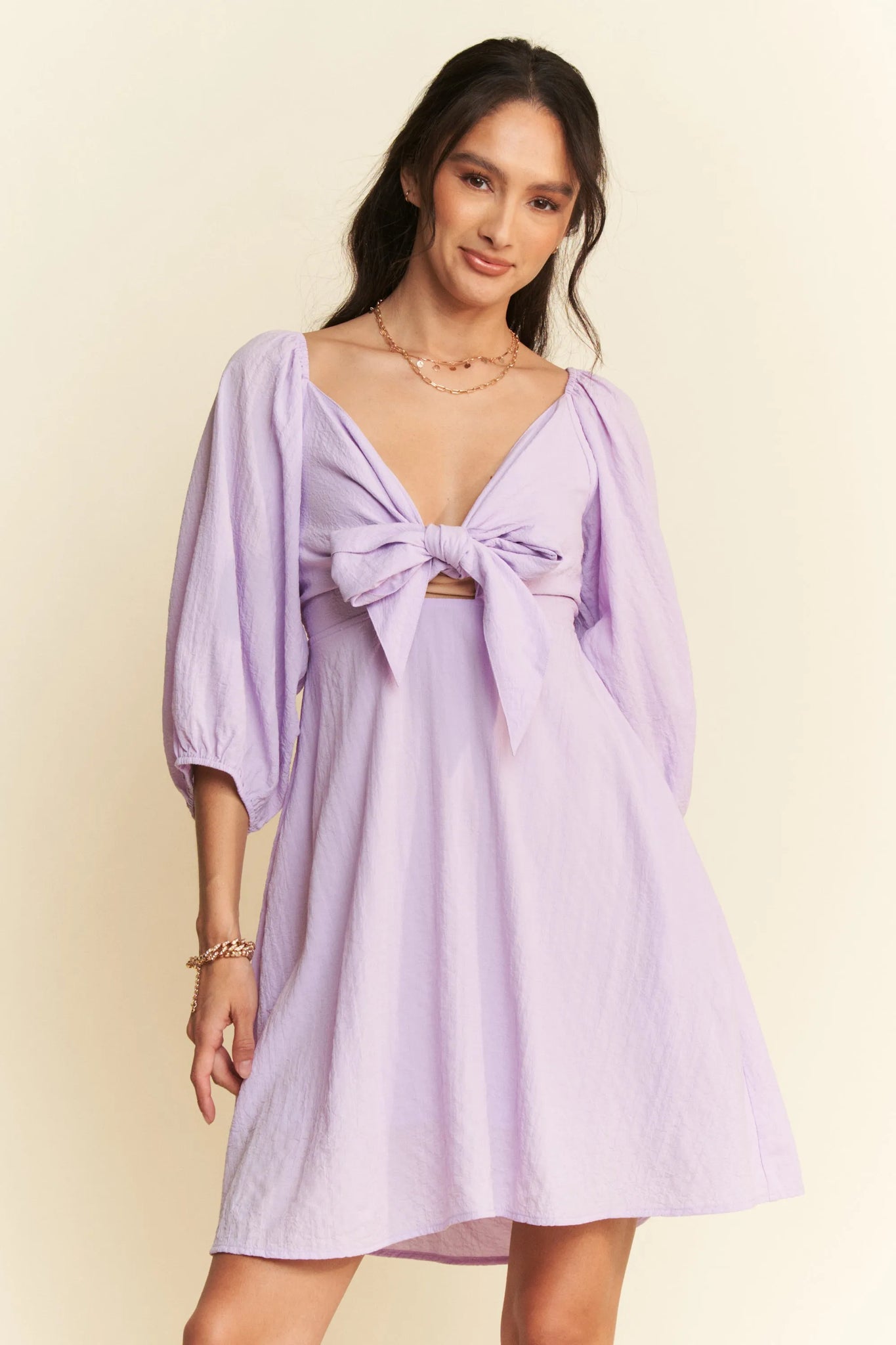 Davi & Dani Self-Tie Puff Sleeve Smocking Open Back Mini Dress