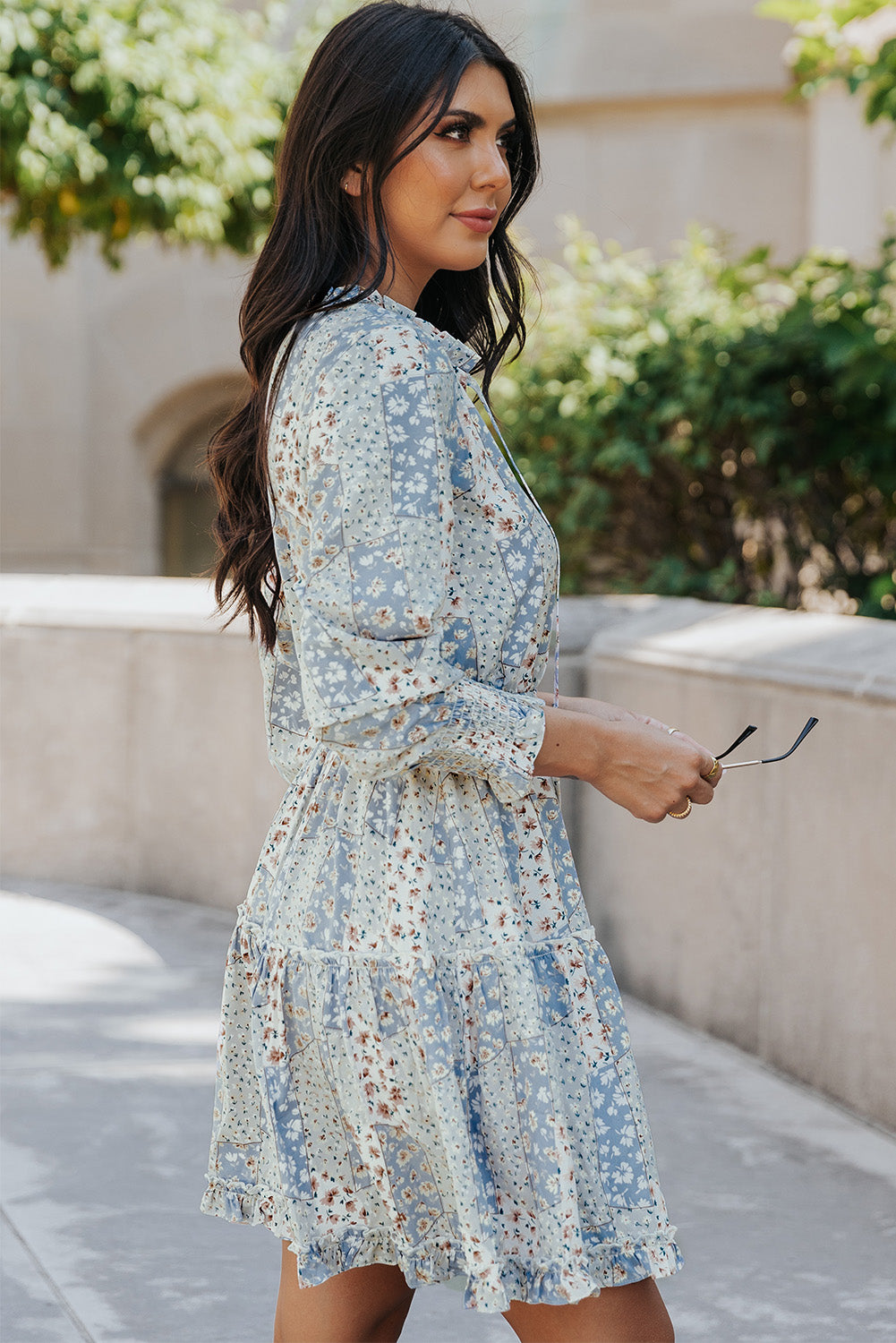 Floral Patchwork Tie-Neck Frill Trim Dress
