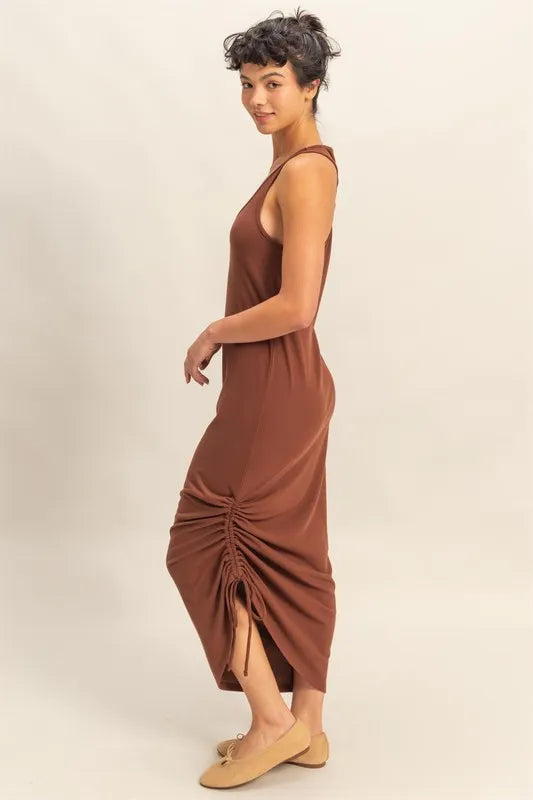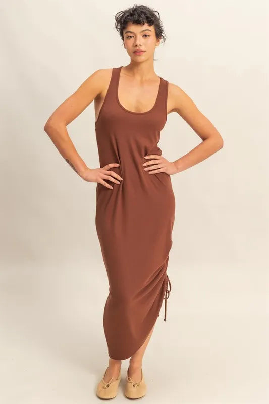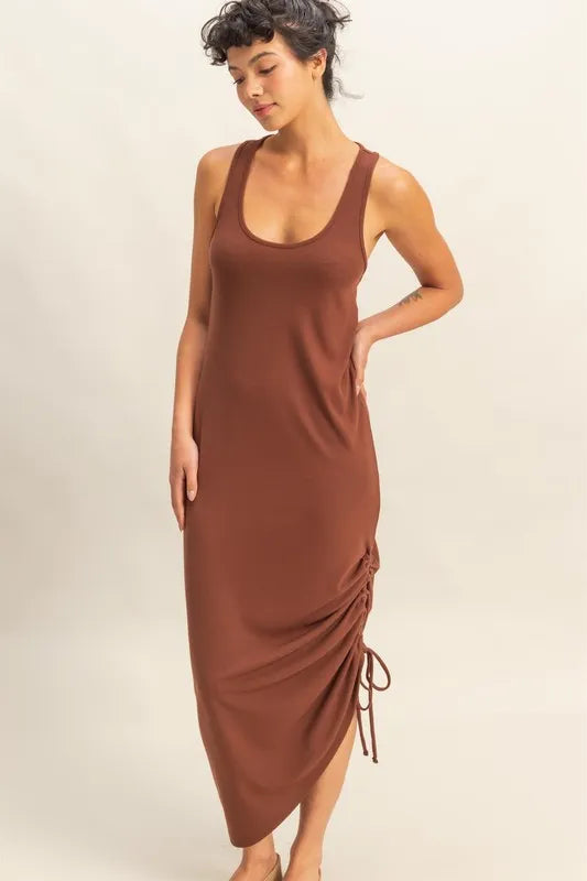 A Scoop Neck Side Tie Detail Midi Dress typically has a flattering scoop neckline and features a tie detail on the side for added style and customization. The midi length falls below the knee, making it a versatile and elegant choice for various events. This style of dress is perfect for a feminine and chic look.