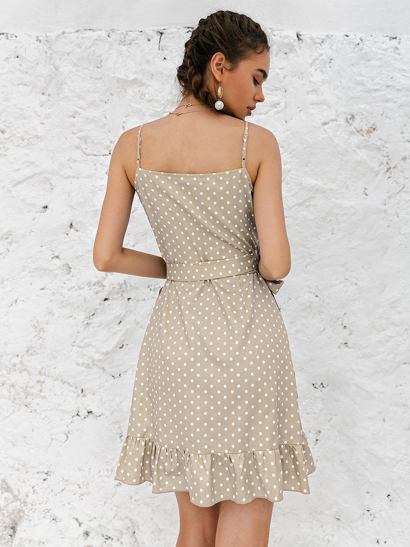 • Features: Adjustable spaghetti strap, tie waist, wrap, mini, ruffle hem
