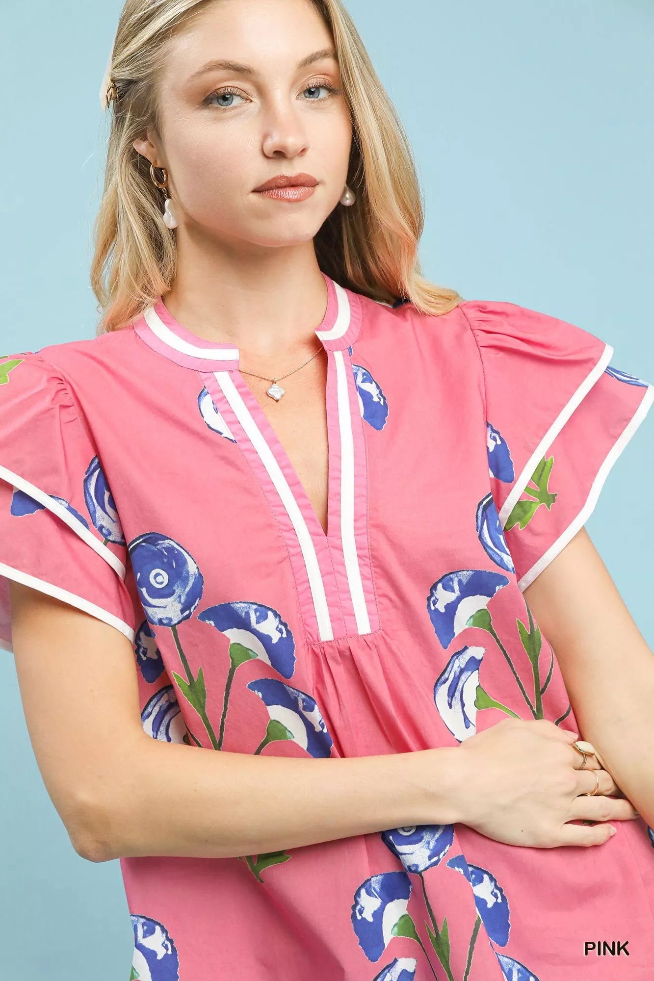 This Blossom Meadow Print Top offers a relaxed fit that is both stylish and comfortable. The split V-neck with contrast trim adds a unique touch to the design. Short flutter sleeves give a feminine and playful look to this top. With a straight hem, it's easy to style and pair with different bottoms. Please note that this top is not lined, making it breathable and perfect for warmer days.