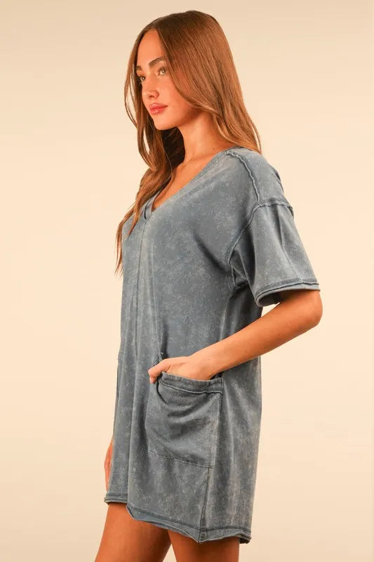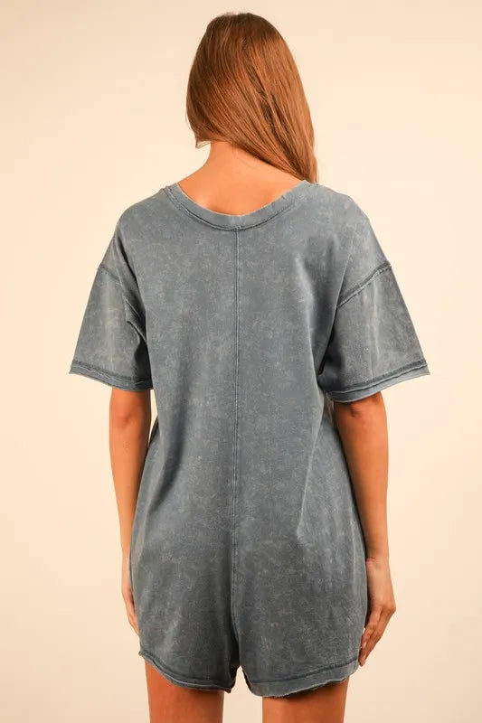 The Mineral Washed Casual Knit Romper is a fashionable and comfortable one-piece outfit. Made from a soft and stretchy knit fabric, it features a trendy mineral washed finish for a casual and laid-back look. With its relaxed fit and versatile style, this romper is perfect for everyday wear or a day out with friends. Just slip it on, add your favorite accessories, and you're ready to go!